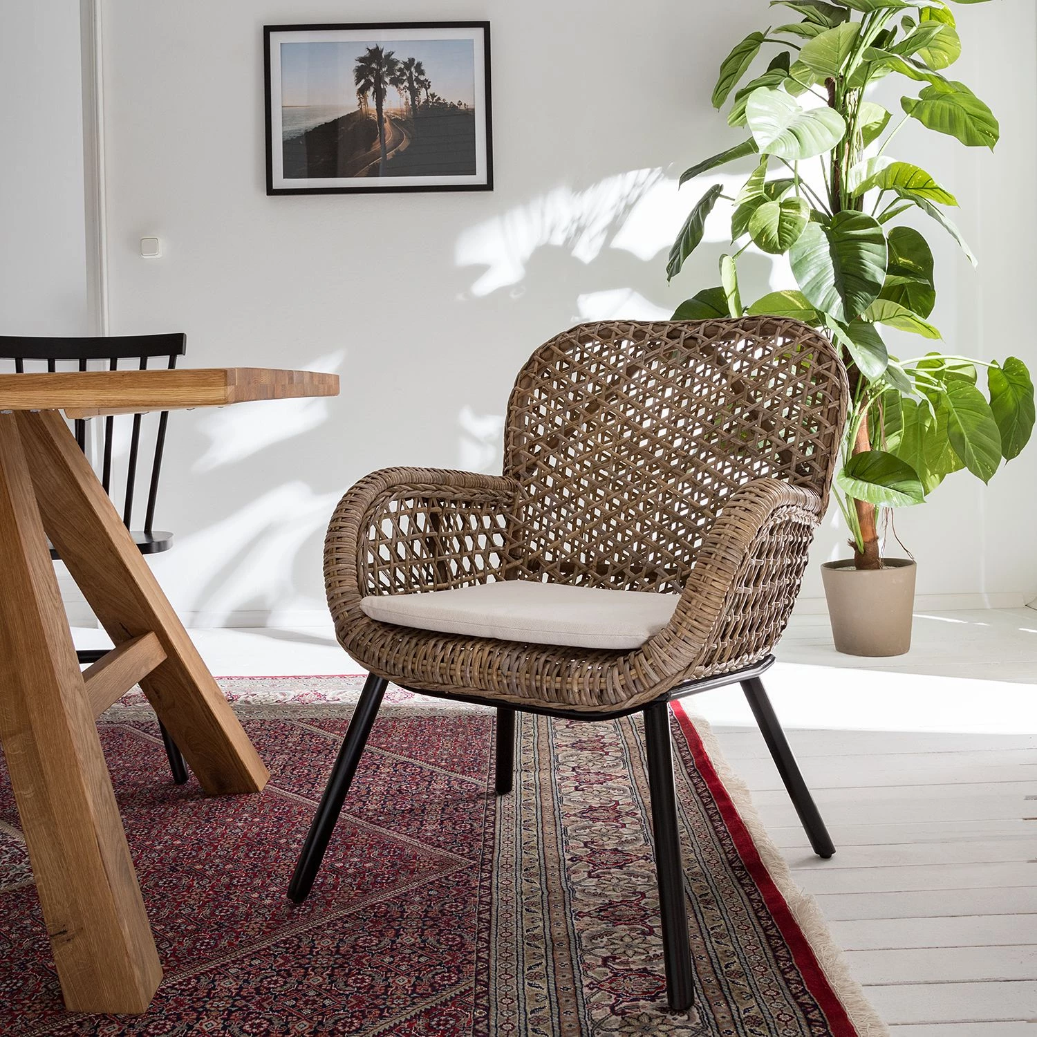 Wer auf der Suche nach einer besonderen Sitzgelegenheit ist, liegt mit dem Armlehnenstuhl Hawea genau richtig. Sein abnehmbares Sitzkissen besteht aus Polyester und verspricht absoluten Komfort. Dazu kann es ganz flexibel auch auf anderen Stühlen verwendet werden. Ein absoluter Eyecatcher stellt allerdings das Rattanmaterial dar, aus welchem das Gestell des Armlehnenstuhls Hawea besteht. Schnell schafft man damit Exotik im Zimmer und vervollständigt den Skandi-Look vor allem dann, wenn weitere Holzmöbel oder stilähnliche Accessoires kombiniert werden.