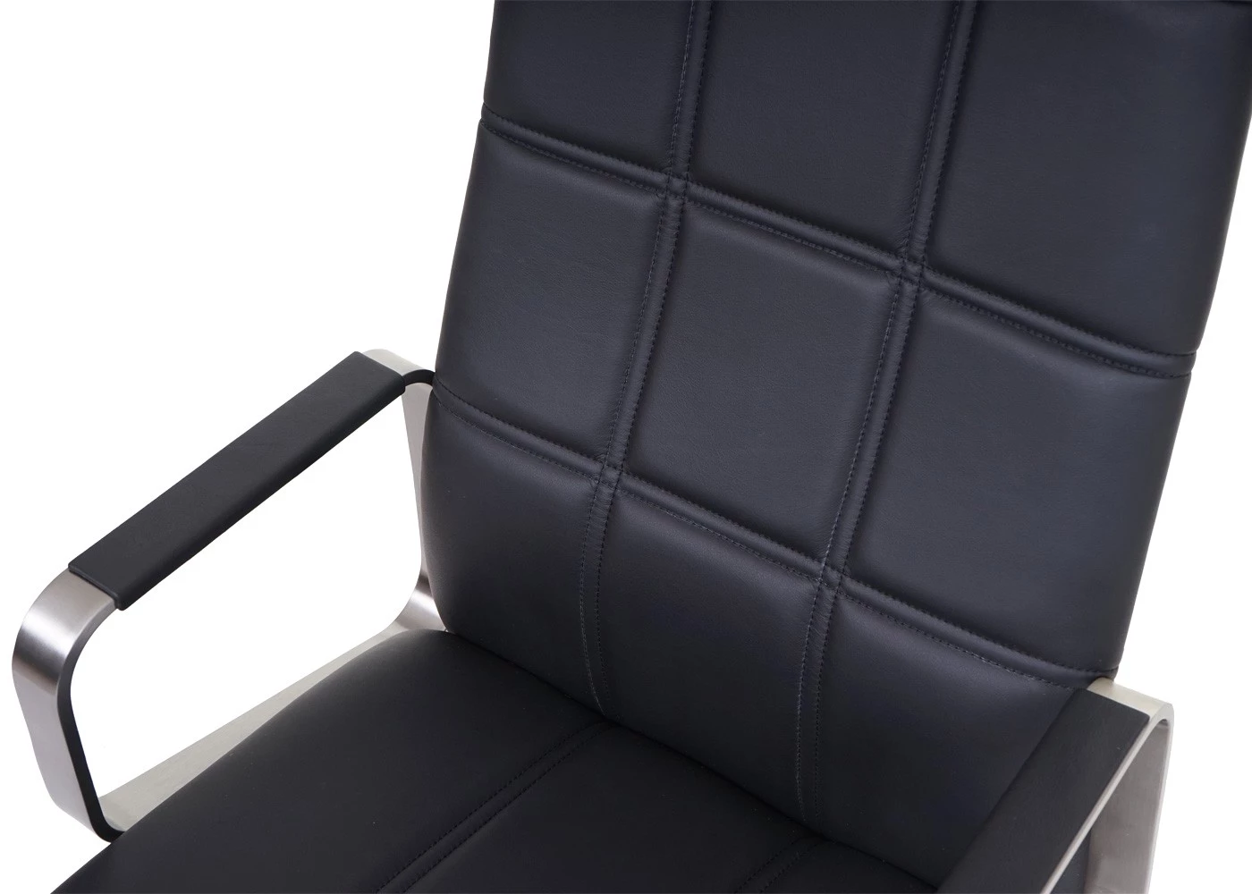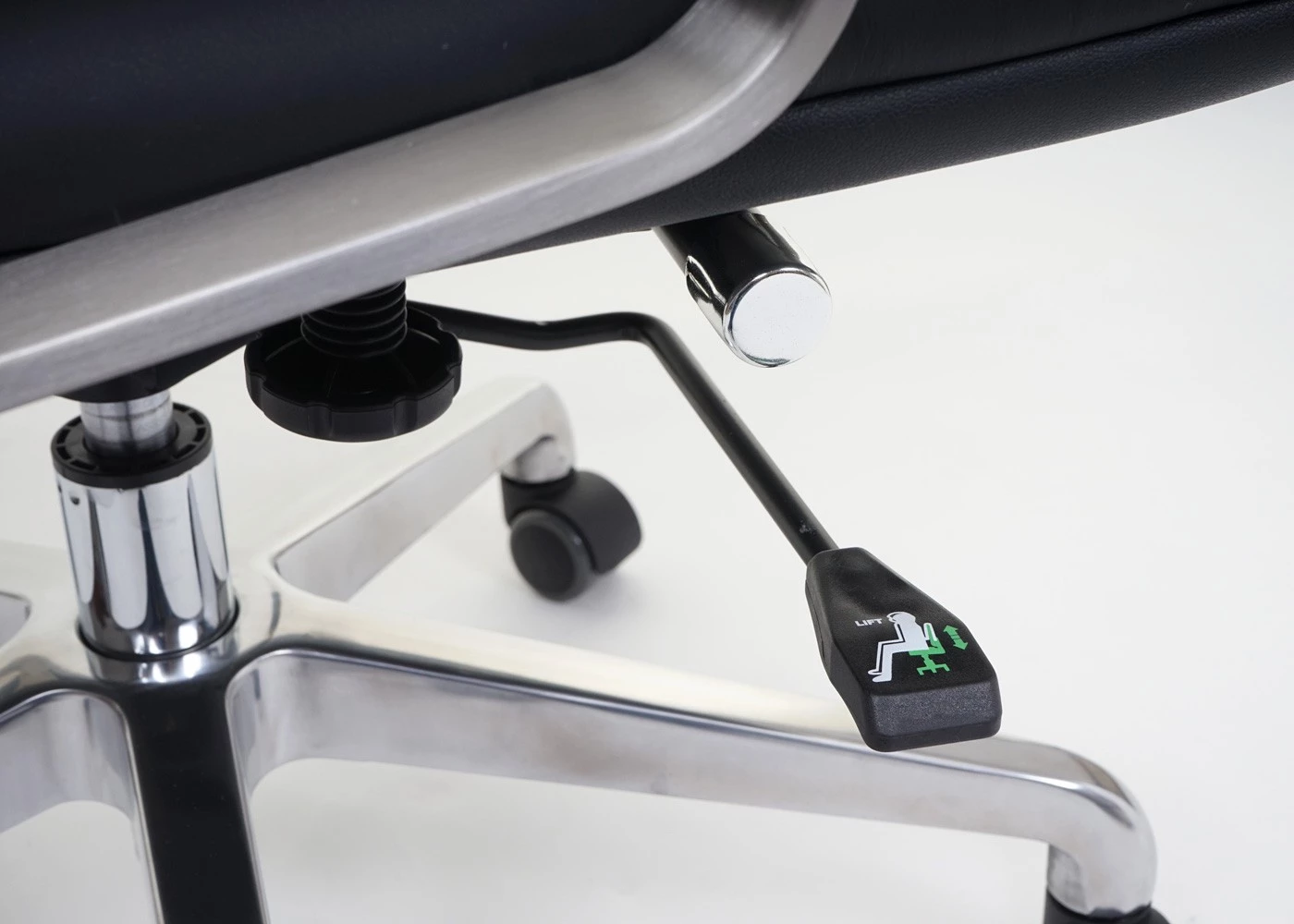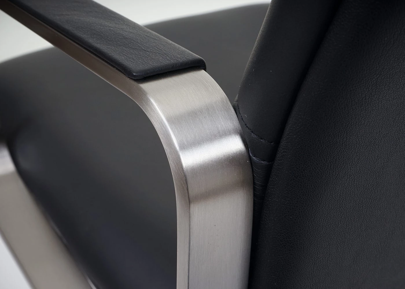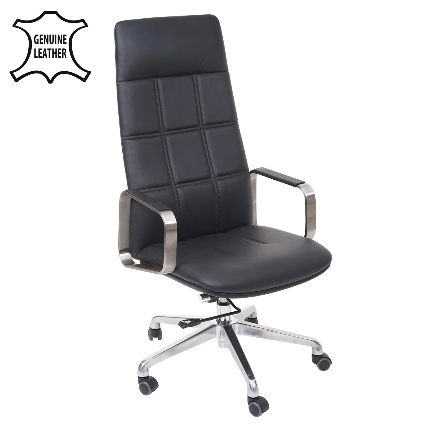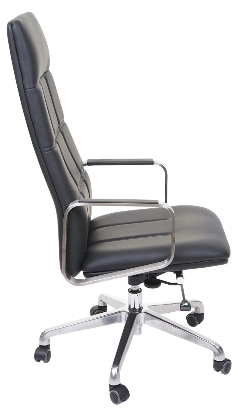Dieser Bürostuhl in modernem und elegantem Design ist nicht nur etwas fürs Auge, sondern erfüllt höchste Ansprüche in Sachen Komfort und Stabilität. Wir präsentieren Ihnen einen gelungen Materialmix aus Leder und Edelstahl. Die Armlehnen sind aus gebürstetem Edelstahl, der Bezug aus elegantem Leder. Die ergonomisch geformte Sitz- und Rückenfläche sorgen dafür, dass Sie innerhalb kürzester Zeit Ihre perfekte Sitzposition finden und über viele Stunden hinweg entspannt arbeiten können. Abgerundet wird das Gesamtbild durch das stabile Fußkreuz, das noch etwas zusätzliche Eleganz im Erscheinungsbild schafft.
