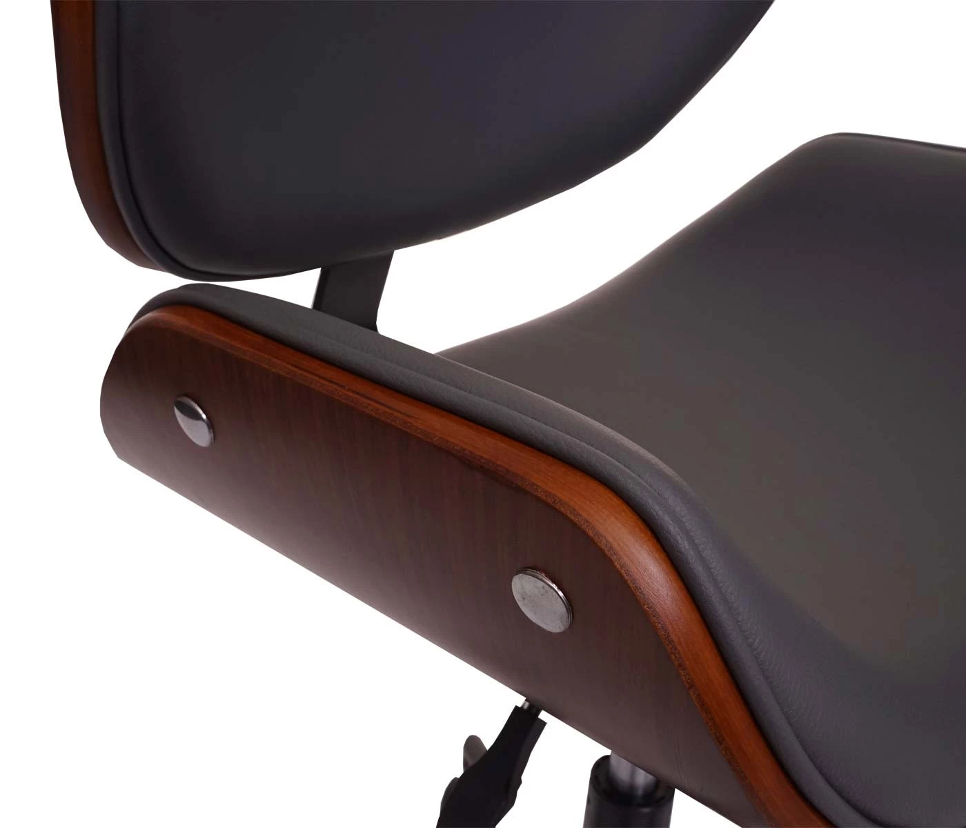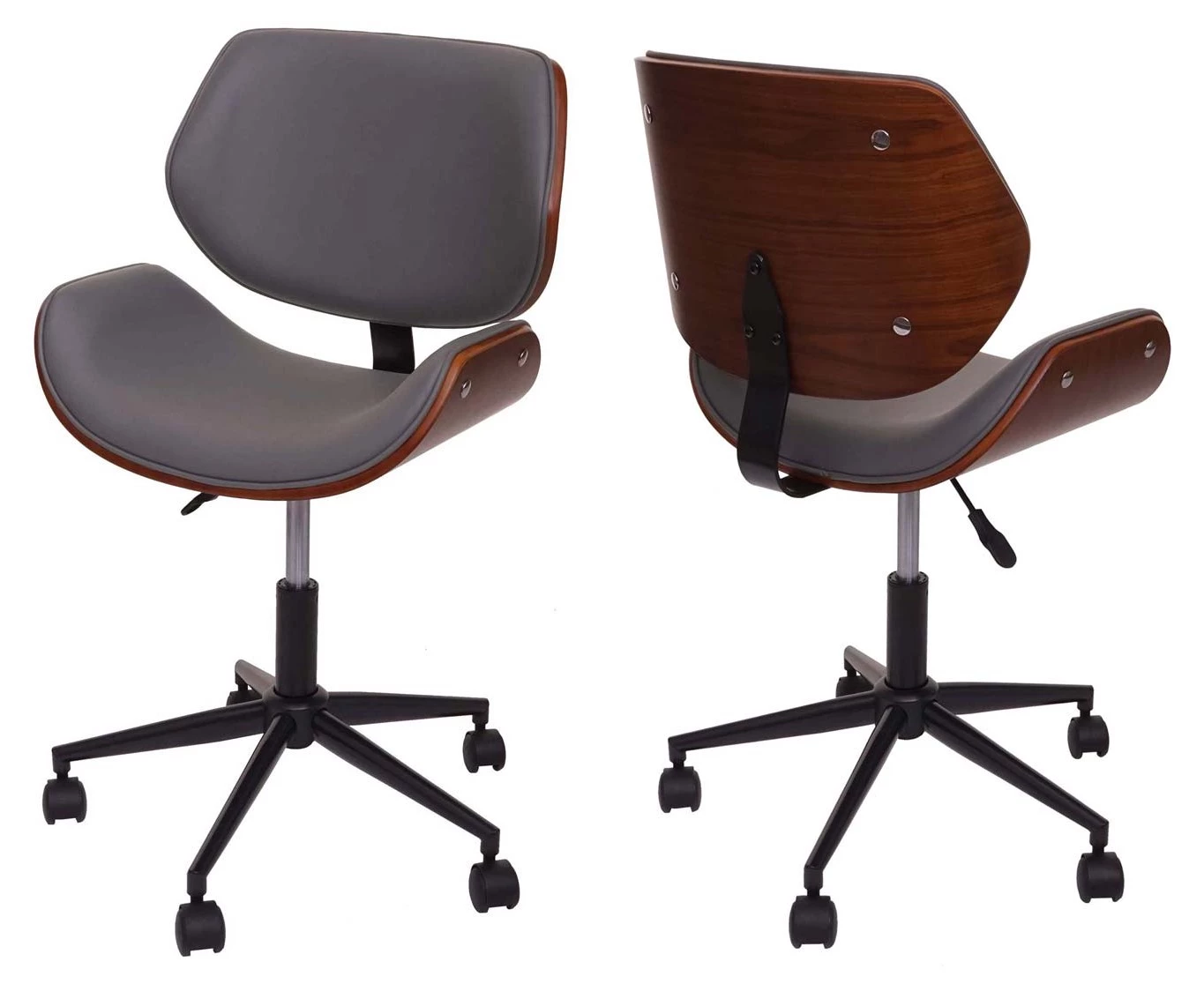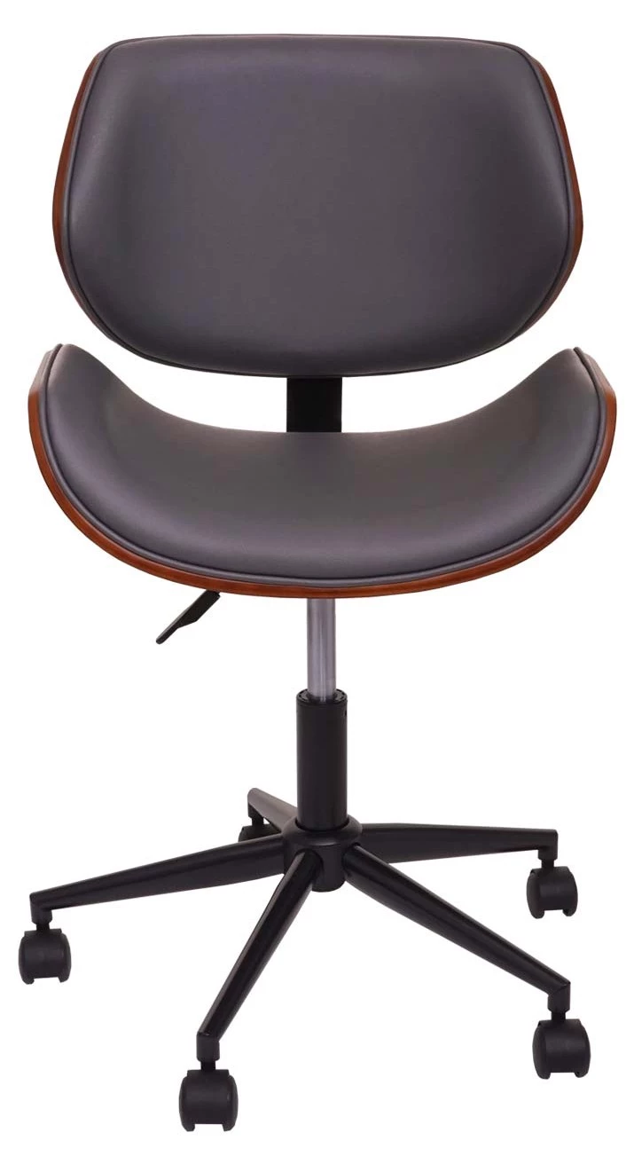 Dieser schicke Bürostuhl im Retro-Look verleiht Ihrem Arbeitsplatz einen edlen Touch. Besonders sticht einem die tolle Optik des gemaserten Bugholzes ins Auge, die perfekt mit der schönen Polsterung aus pflegeleichten Kunstleder harmoniert.