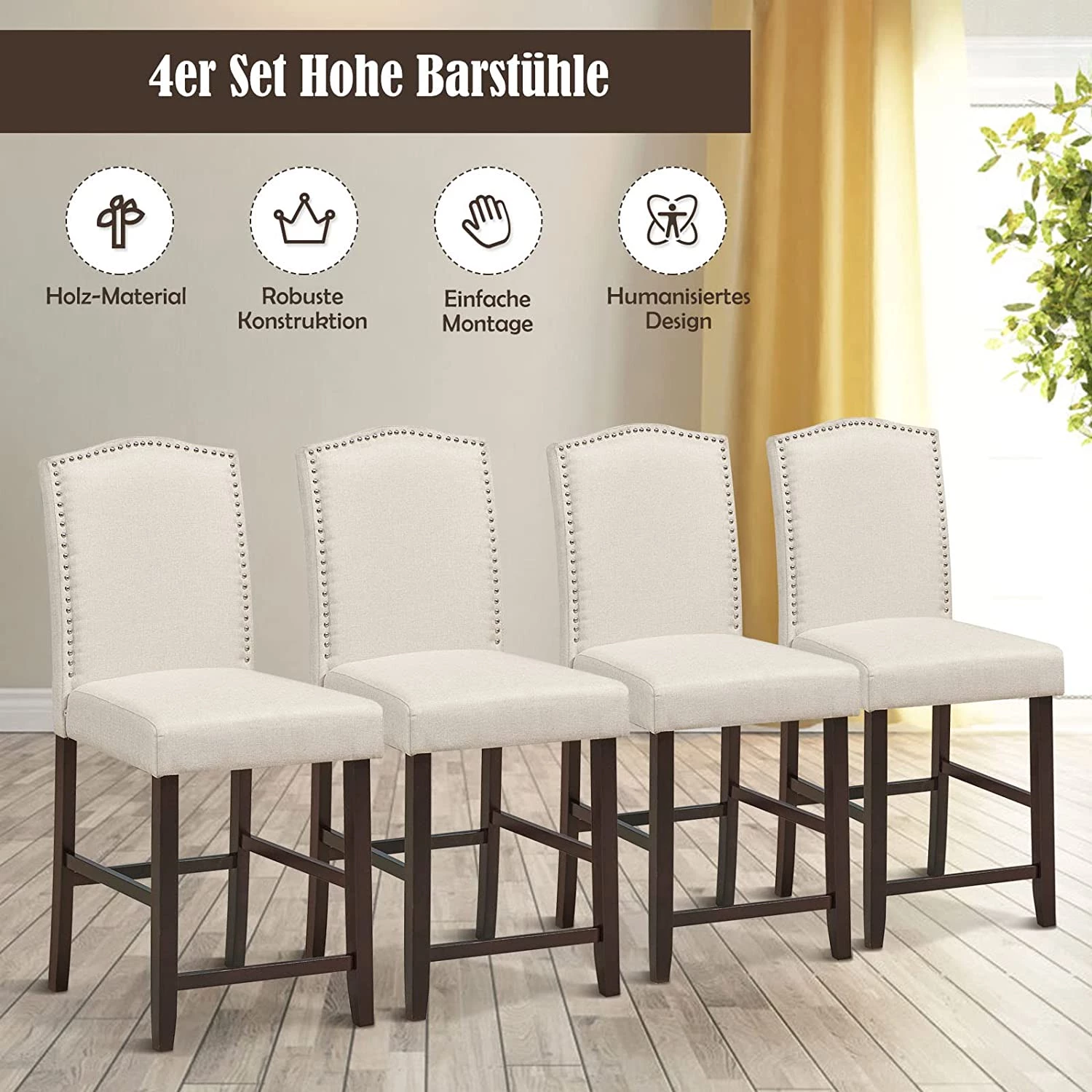 Suchen Sie noch nach bequemen und stilvollen Barhockern? Dann sind unsere praktischen und eleganten Modelle ideal für Sie. Durch ihre robuste Holzkonstruktion sind sie sehr stabil. Zudem besteht die Polsterung aus umweltfreundlichem und atmungsaktivem Leinen sowie elastischem Schaumstoff, wodurch der Komfort gewährleistet wird. Lehnen Sie sich zurück und stellen Sie Ihre Füße auf die Fußstütze, und Sie werden sich wunderbar entspannen können. Unser Set wird Sie also definitiv begeistern.