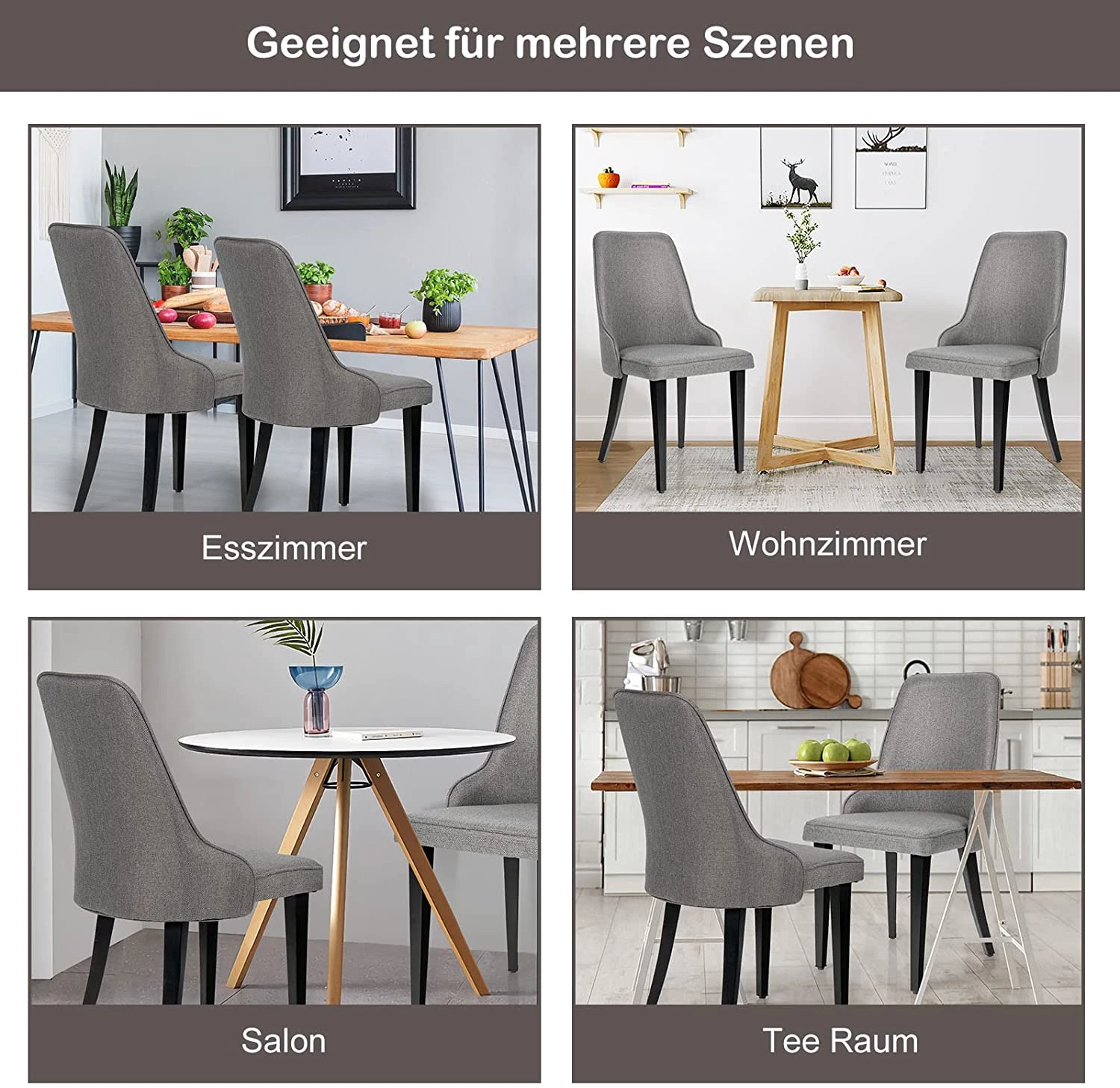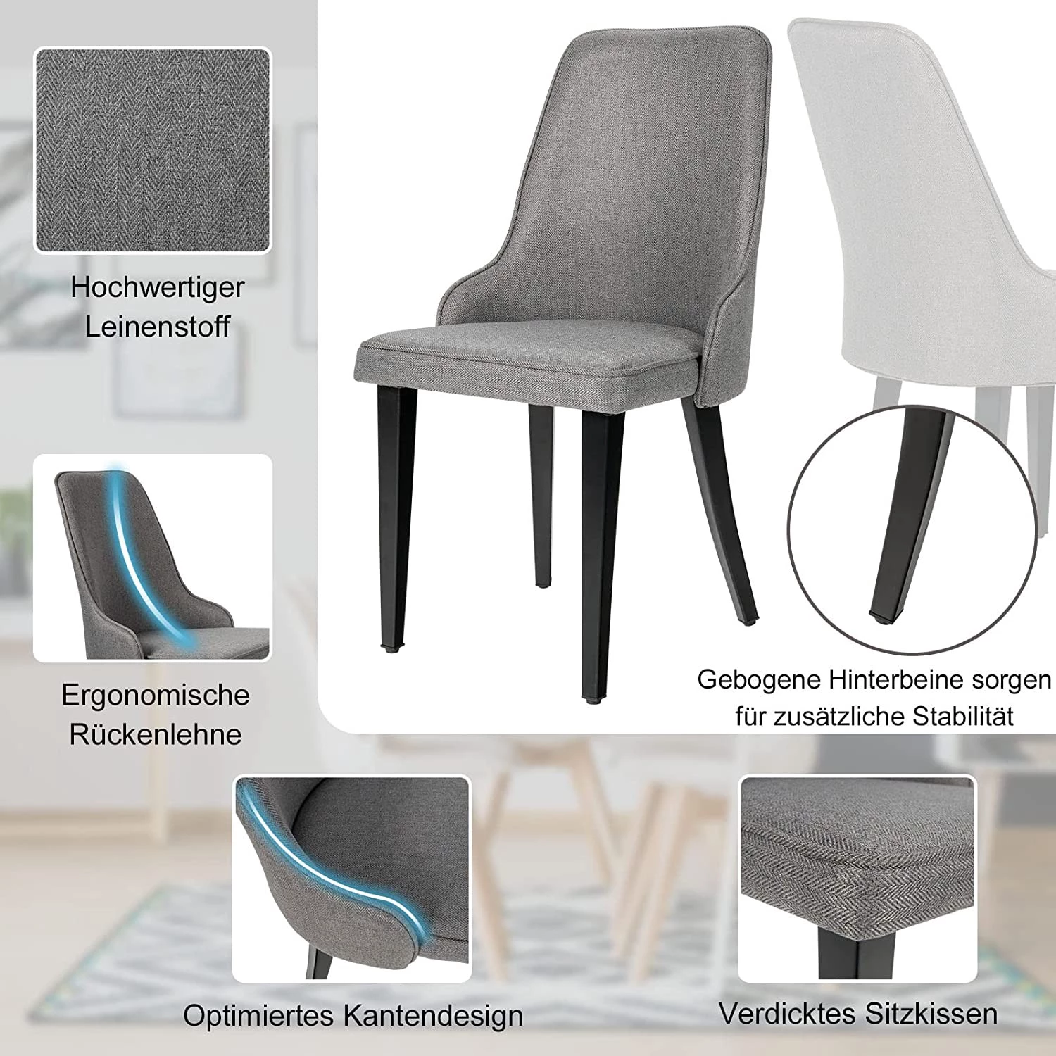 Unsere Esszimmerstühle sind eine perfekte Ergänzung für Ihr Zuhause! Die pulverbeschichteten Metallbeine sind rostresistent und langlebig, außerdem gewährleisten sie die Tragkraft von 120 kg. Der Stoff und die weiche Polsterung sind sehr komfortabel. Außerdem können Sie sich schön an der ergonomischen Rückenlehne anlehnen. Die Stühle eignen sich ideal für Küchen, Esszimmer, Cafés, Restaurants, etc. Zögern Sie also nicht länger und schlagen Sie zu!