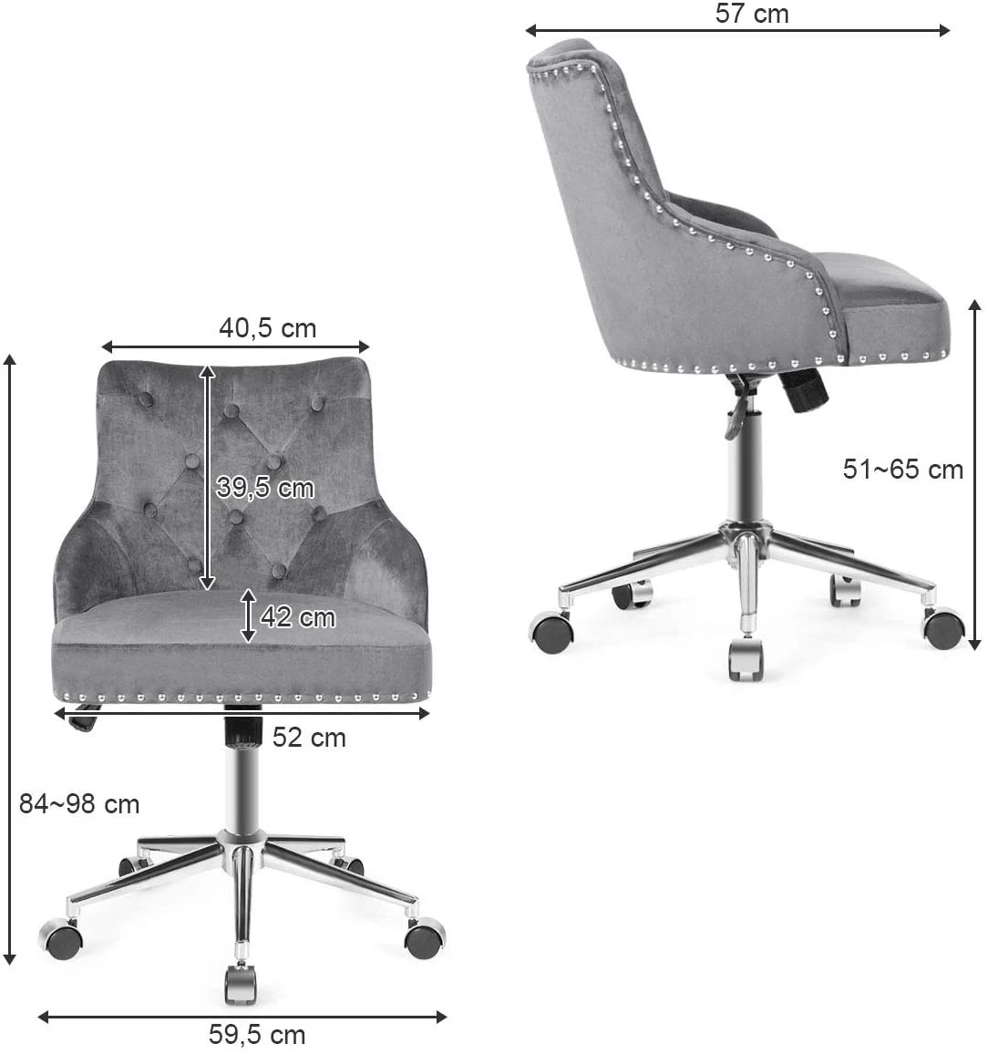 Dies ist unser brandneuer Samt Bürostuhl mit stilvollem Aussehen und praktischer Funktion, um dafür zu sorgen, dass Sie sich den ganzen Tag wohlfühlen! Der weiche und warme Samt-Stoff ist sehr angenehm in der Berührung. Die ergonomischen Rücken- und Armlehnen können effektiv zur Entspannung Ihres Rückens und Ihrer Hände beitragen, sodass Sie sich nicht erschöpft fühlen, selbst wenn Sie für lange Zeit sitzen. Außerdem kann die Sitzhöhe verstellt und so an viele verschiedene Tischhöhen angepasst werden, für eine angenehme Benutzung. Fünf Räder an der Basis sorgen für ein einfaches und flüssiges Bewegen auf dem Boden. Der Stuhl ist definitiv die beste Ergänzung für Ihr Büro, Arbeitszimmer oder andere Orte!