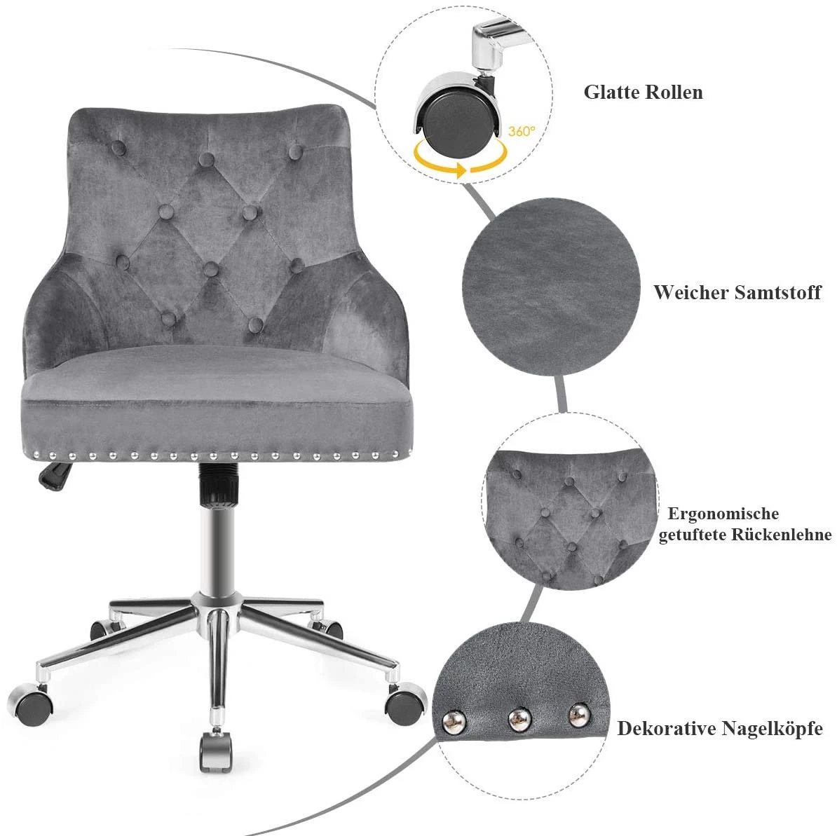 【Geschmeidige & Haltbare Transportrollen】 Der Samt Bürostuhl besitzt 5 leise Universalräder, die anti-rutsch Vorrichtungen und Resistenz gegen Abnutzung besitzen, während sie gleichzeitig effektiv das Verkratzen des Bodens verhindern. Die hohe Flexibilität erlaubt es dem Stuhl, sich flüssig und schnell in alle Richtungen zu bewegen, wodurch bequemes Multitasking Ihrerseits begünstigt wird.