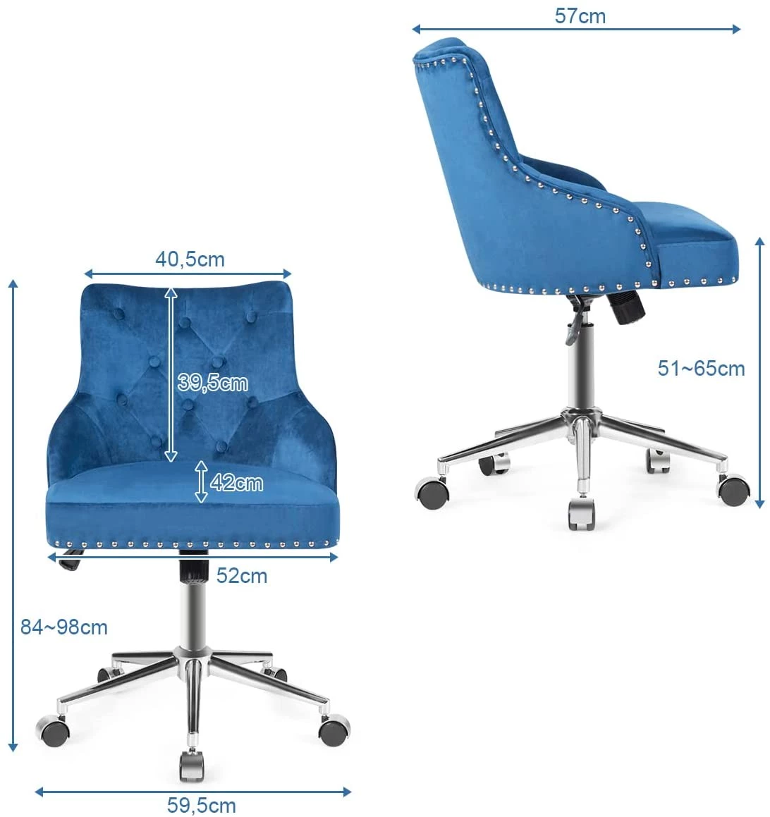 Dies ist unser brandneuer Samt Bürostuhl mit stilvollem Aussehen und praktischer Funktion, um dafür zu sorgen, dass Sie sich den ganzen Tag wohlfühlen! Der weiche und warme Samt-Stoff ist sehr angenehm in der Berührung. Die ergonomischen Rücken- und Armlehnen können effektiv zur Entspannung Ihres Rückens und Ihrer Hände beitragen, sodass Sie sich nicht erschöpft fühlen, selbst wenn Sie für lange Zeit sitzen. Außerdem kann die Sitzhöhe verstellt und so an viele verschiedene Tischhöhen angepasst werden, für eine angenehme Benutzung. Fünf Räder an der Basis sorgen für ein einfaches und flüssiges Bewegen auf dem Boden. Der Stuhl ist definitiv die beste Ergänzung für Ihr Büro, Arbeitszimmer oder andere Orte!