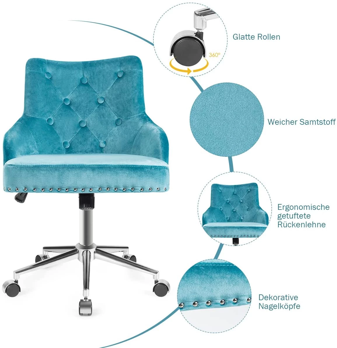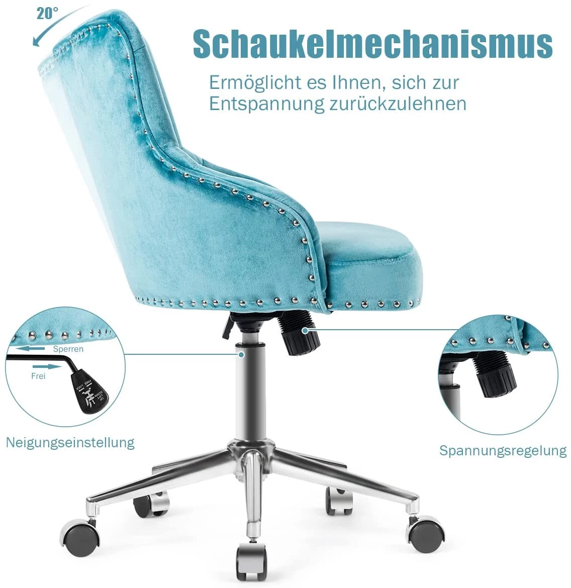 【Geschmeidige & Haltbare Transportrollen】 Der Samt Bürostuhl besitzt 5 leise Universalräder, die anti-rutsch Vorrichtungen und Resistenz gegen Abnutzung besitzen, während sie gleichzeitig effektiv das Verkratzen des Bodens verhindern. Die hohe Flexibilität erlaubt es dem Stuhl, sich flüssig und schnell in alle Richtungen zu bewegen, wodurch bequemes Multitasking Ihrerseits begünstigt wird.