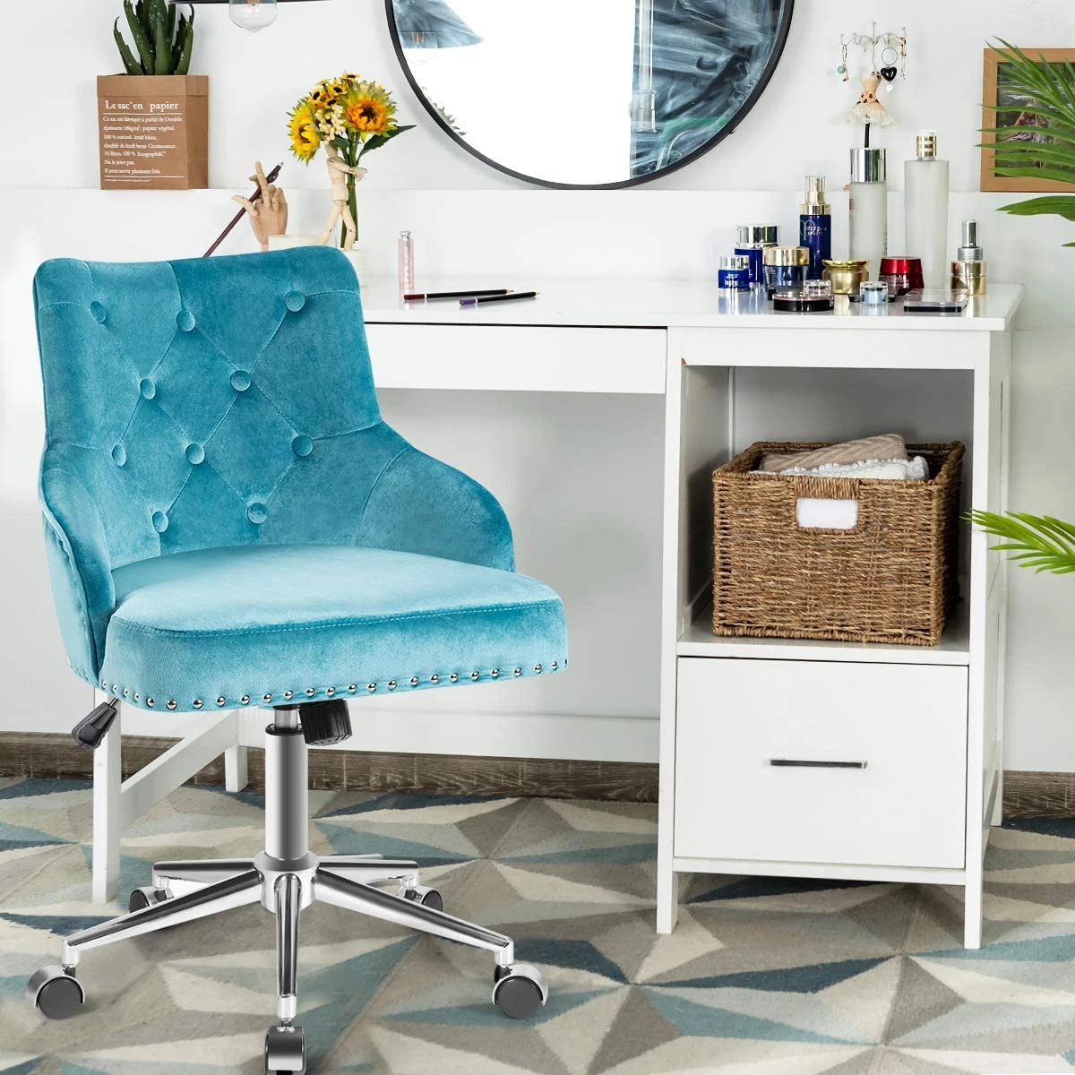 【Weitreichende Anwendungsmöglichkeiten】 Dieser Stuhl kombiniert geschickt nostalgische und moderne Elemente. Das klassisch mit Knöpfen getuftete Design und die dekorativen Nagelköpfe kreieren ein bezauberndes und elegantes Aussehen, wodurch sich der Stuhl in eine Vielzahl von Einrichtungsstilen bestens einfügt. Er ist geeignet für Schlafzimmer, Arbeitszimmer, Büro, etc.