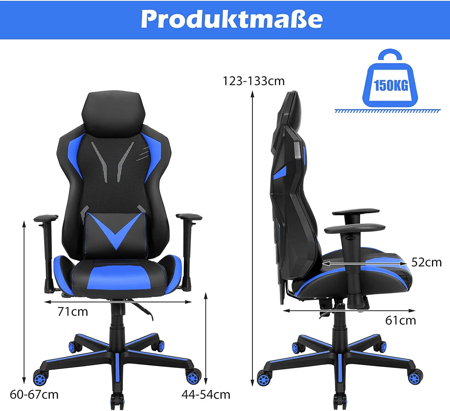 【Stabile & robuste Konstruktion】 Der Computerstuhl ist durch seinen robusten Stahlrahmen robust und langlebig. Er hat eine Tragkraft von 150 kg. Außerdem gewährleistet die Basis mit 5 Rollen die Stabilität des Tisches.