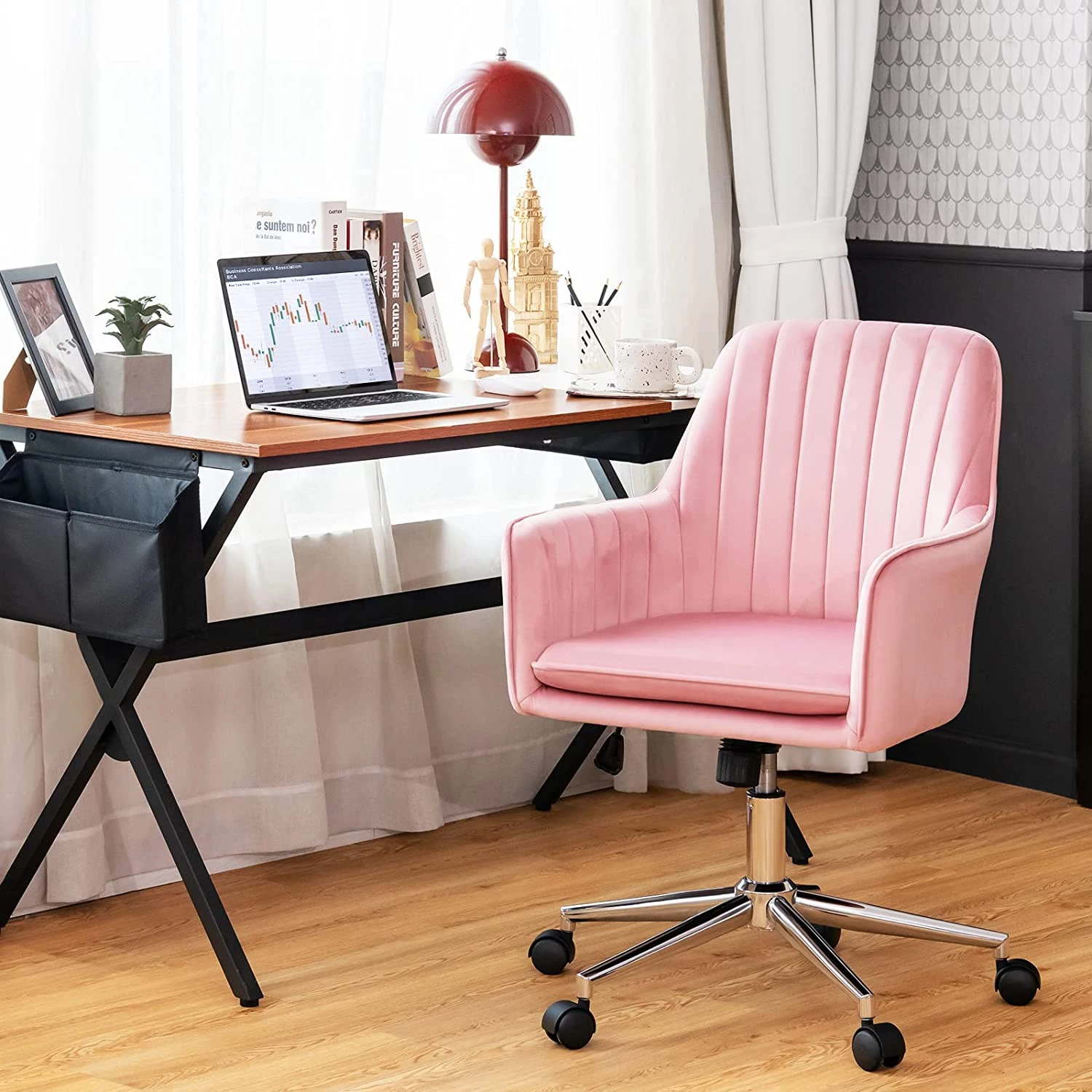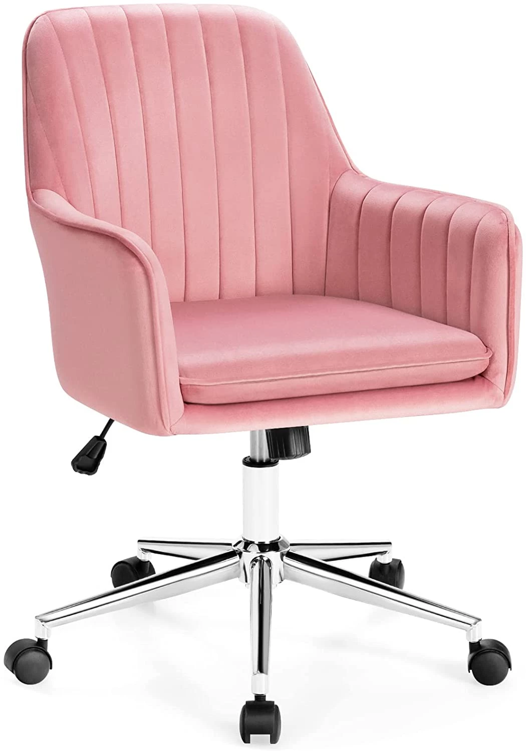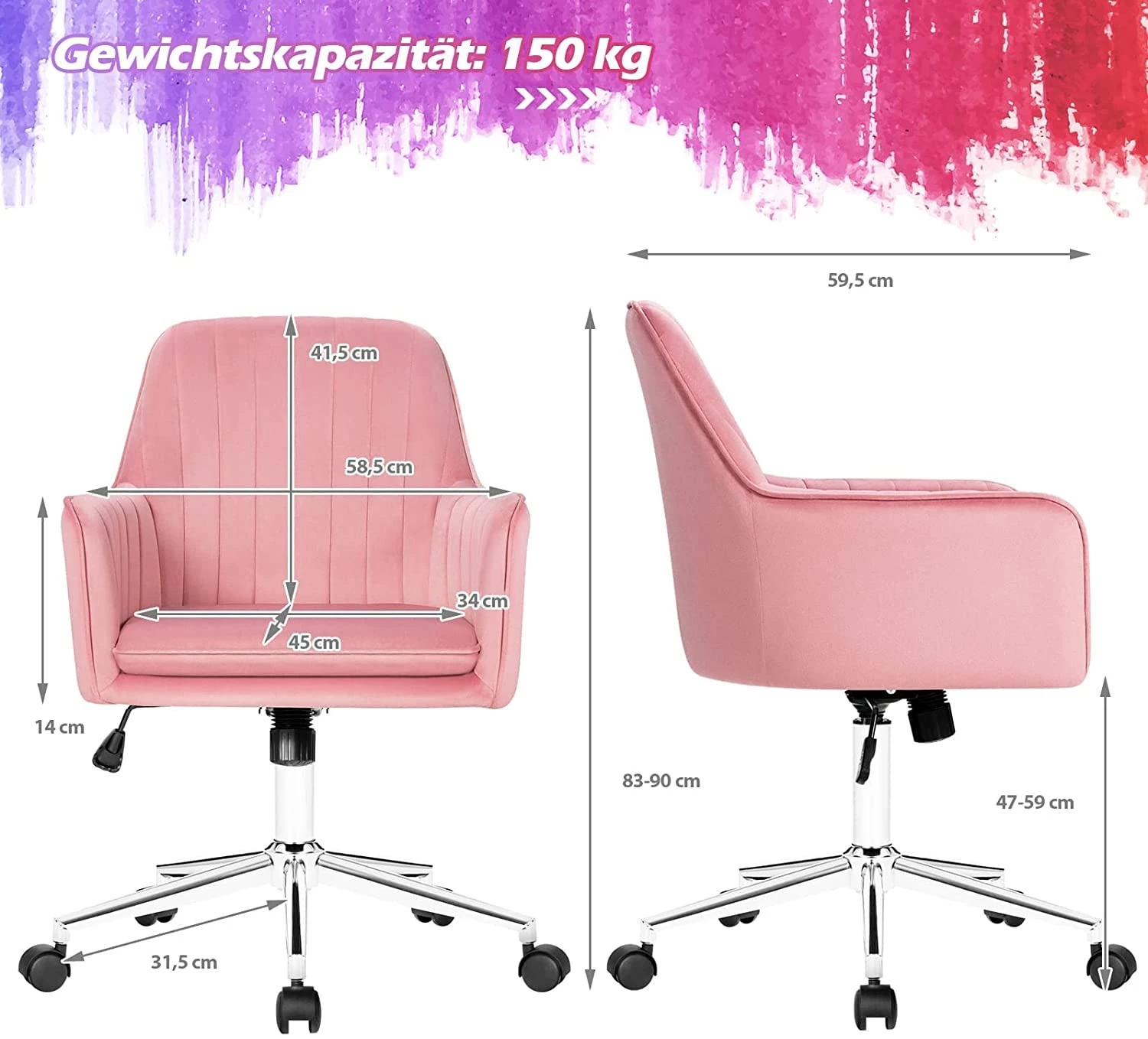 Durch seinen Metallfuß ist eine hohe Gesamtstabilität gegeben. Bezogen ist er mit weichem Samt und gepolstert mit hochelastischem Schaumstoff, wodurch für den Komfort gesorgt ist. Durch das ergonomische Design mit Armlehnen können Sie sich wunderbar entspannen. Die Sitzhöhe ist von 83 cm bis 90 cm verstellbar, wodurch sich der Stuhl für verschiedenste Benutzer eignet. Der Bezug ist zudem abnehmbar und kann bei Bedarf ausgetauscht werden. Daher eignet sich dieser Stuhl für Büros, Schminktische usw.