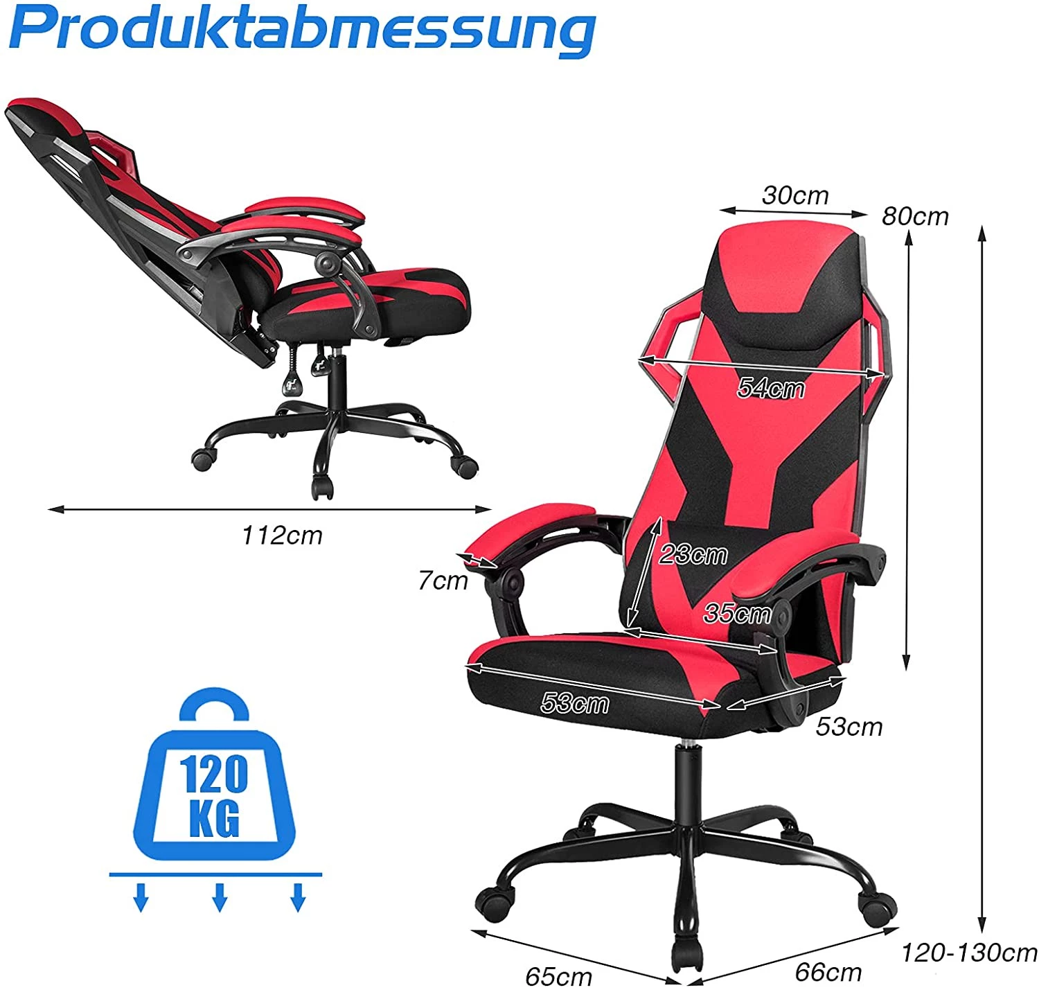 Suchen Sie noch nach einem Gaming- oder Bürostuhl? Dann ist unser ergonomischer Stuhl die perfekte Wahl für Sie! Im Alltag kann er äußerst vielseitig eingesetzt werden. Seine Höhe lässt sich einstellen, genauso wie der Winkel der Rückenlehne (90°-135°), um stets eine bequeme Position zum Arbeiten, Gamen, Schlafen, etc. zu machen. Der mit Schaumstoff gepolsterte Sitz ist sehr bequem, und auch das Lendenkissen, die große Kopfstütze und die weichen Armlehnen tragen zum Komfort bei. Durch sein robustes Gestell steht der Stuhl sehr stabil und kann bis zu 120 kg tragen. Zudem ist der weiche Stoff atmungsaktiv.