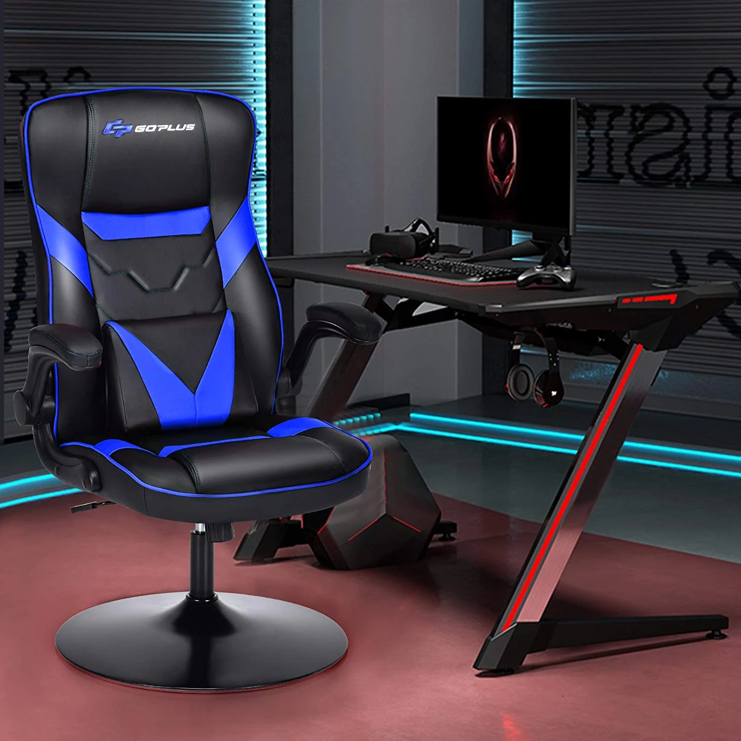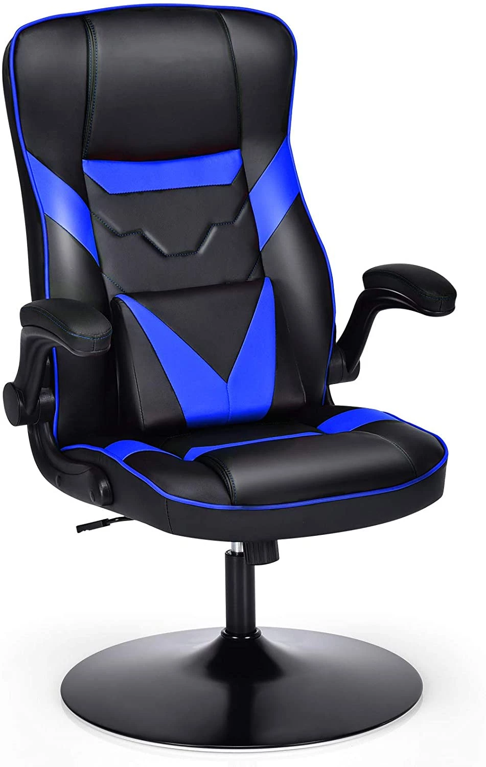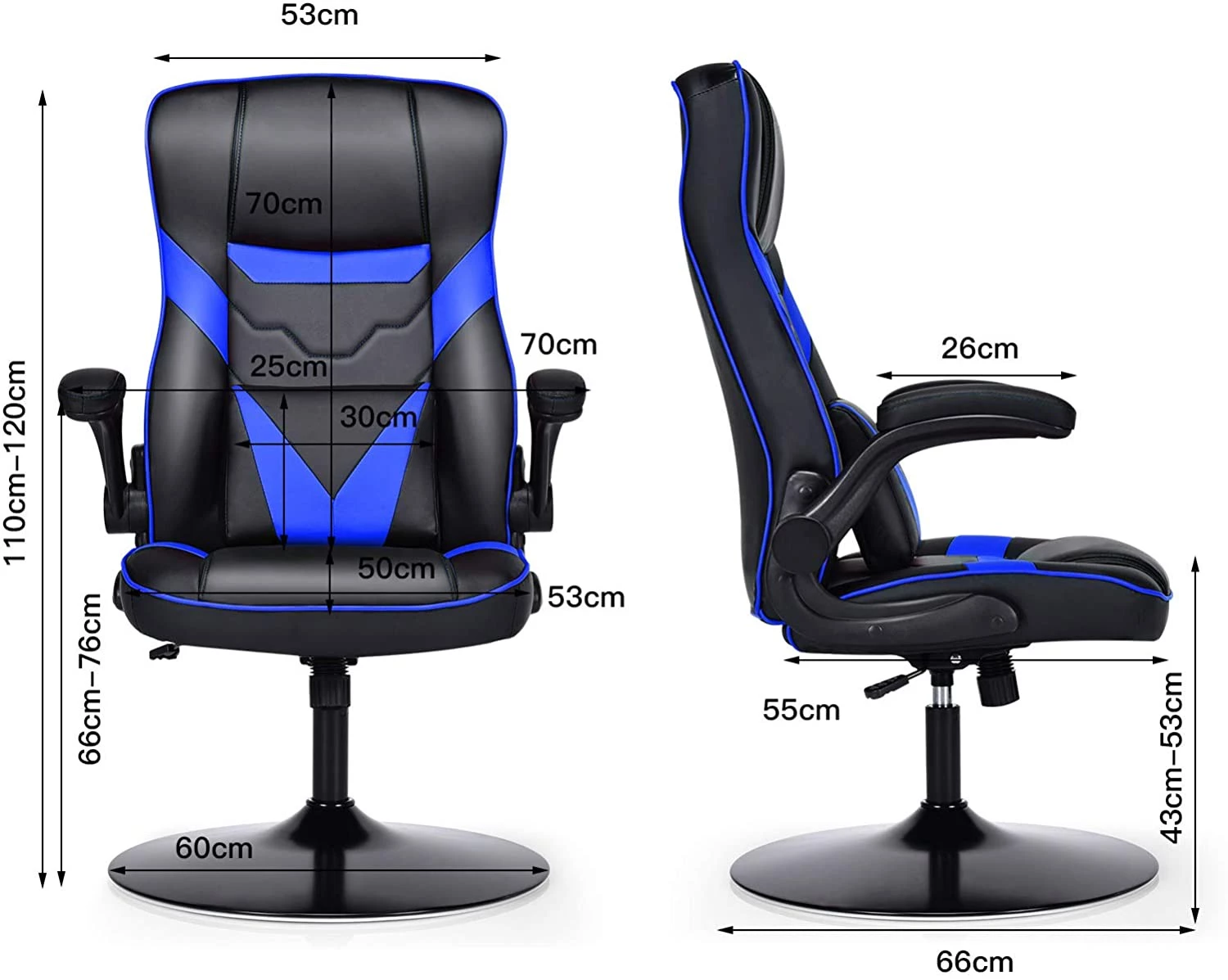 Die Sitzhöhe kann an die Bedürfnisse verschiedener Personen angepasst werden. Das ergonomische Prinzip spiegelt sich perfekt in der breiten Rückenlehne, den hochklappbaren, gepolsterten Armlehnen und der Lendenwirbelstütze wider, die alle zu einem äußerst bequemen Sitzen beitragen. Darüber hinaus fühlen sichdiedichte Polsterung und das glatte PU- und PVC-Leder sehr weich und hautfreundlich an. Das runde Metallchassis macht die Struktur stabil. Der Stuhl im Rennsport-Stil kann Ihnen nicht nur helfen, Videospiele intensiver zu erleben, sondern auch als Stuhl für die Arbeit dienen.