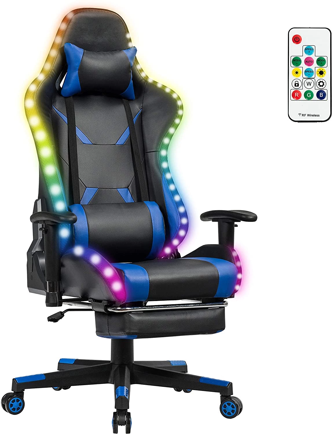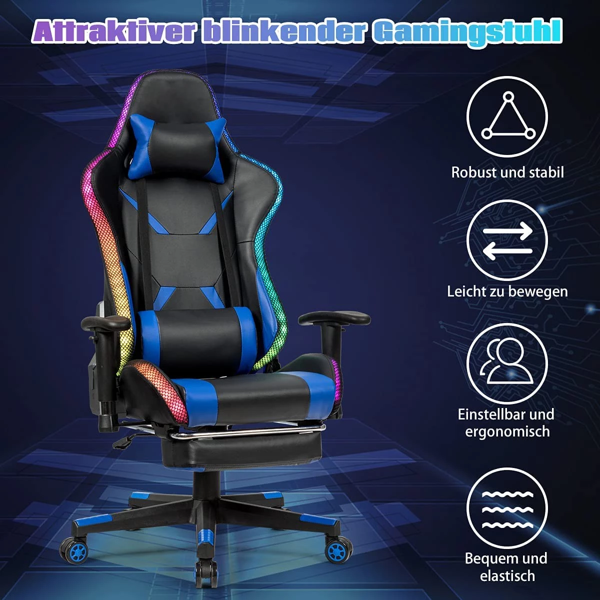 Ausgestattet mit einstellbarer Rückenlehne, erlaubt der Gaming Stuhl es Ihnen, den besten Winkel zum arbeiten, gamen und für ein Nickerchen zu finden. Das hautfreundliche PU Leder, in Kombination mit dem hoch verdichteten Schwammgewebe, sorgt für ein weiches und gemütliches Sitzgefühl. Die bunten Lichter des Stuhls erzeugen ein wissenschaftliches Flair beim gamen, welches Ihren Raum einzigartig machen wird.