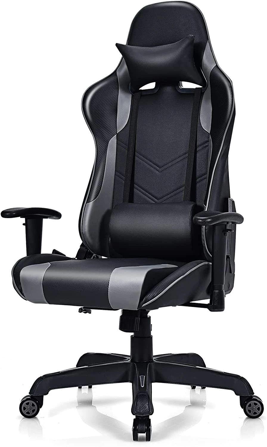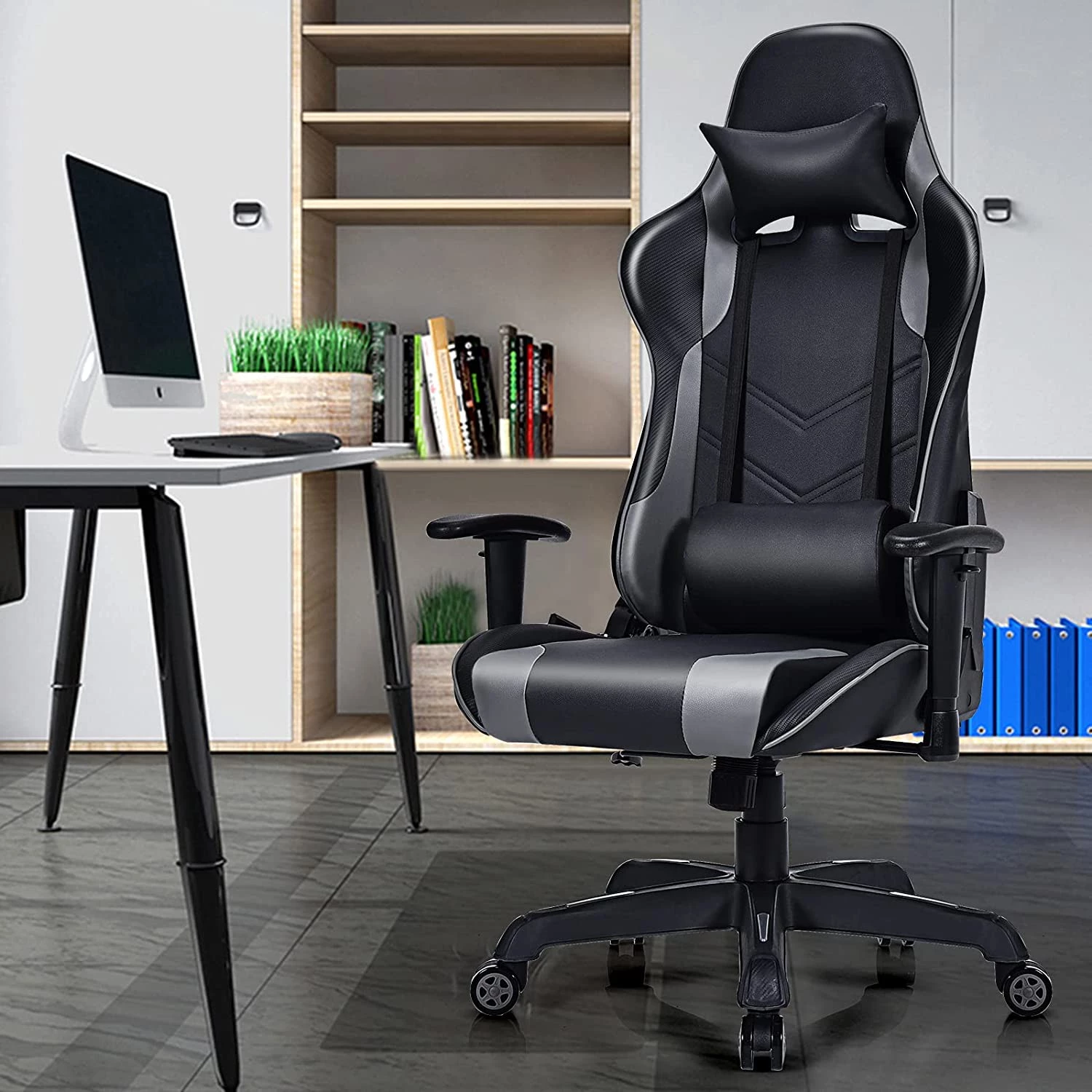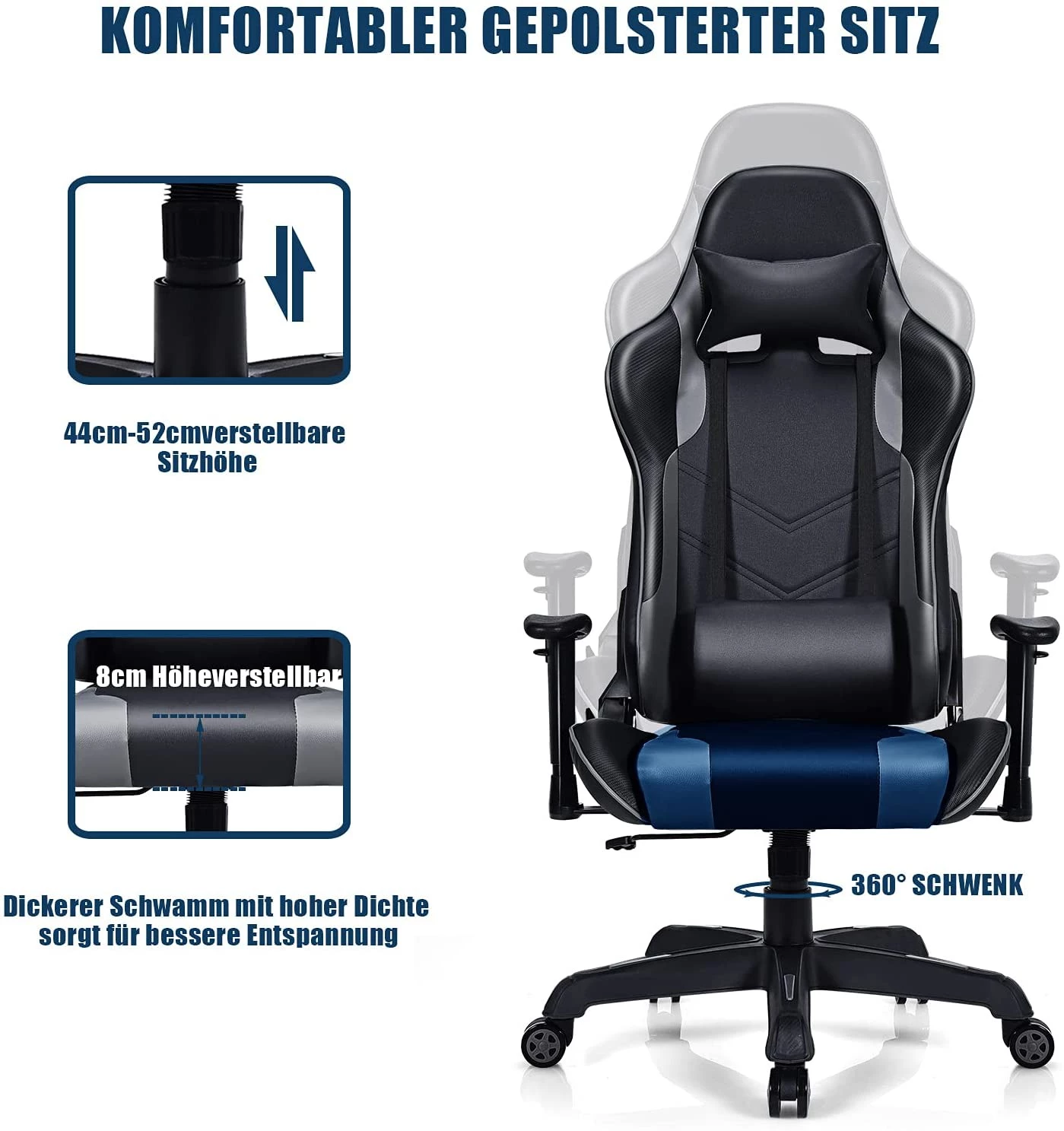 Durch die dicke Polsterung sowie das Lendenkissen ist er sehr komfortabel und daher ideal fürs Arbeiten oder Spielen. Durch den robusten Stahl und das verschleißfeste PVC hat er eine langlebige Konstruktion, die bis zu 150 kg tragen kann. Lehne und Sitz sind verstellbar und daher sehr bequem. Außerdem sorgen die praktischen Rollen für eine einfache Bewegung. Dieser moderne Stuhl mit robuster PVC-Oberfläche ist eine gute Wahl für Zuhause oder das Büro.