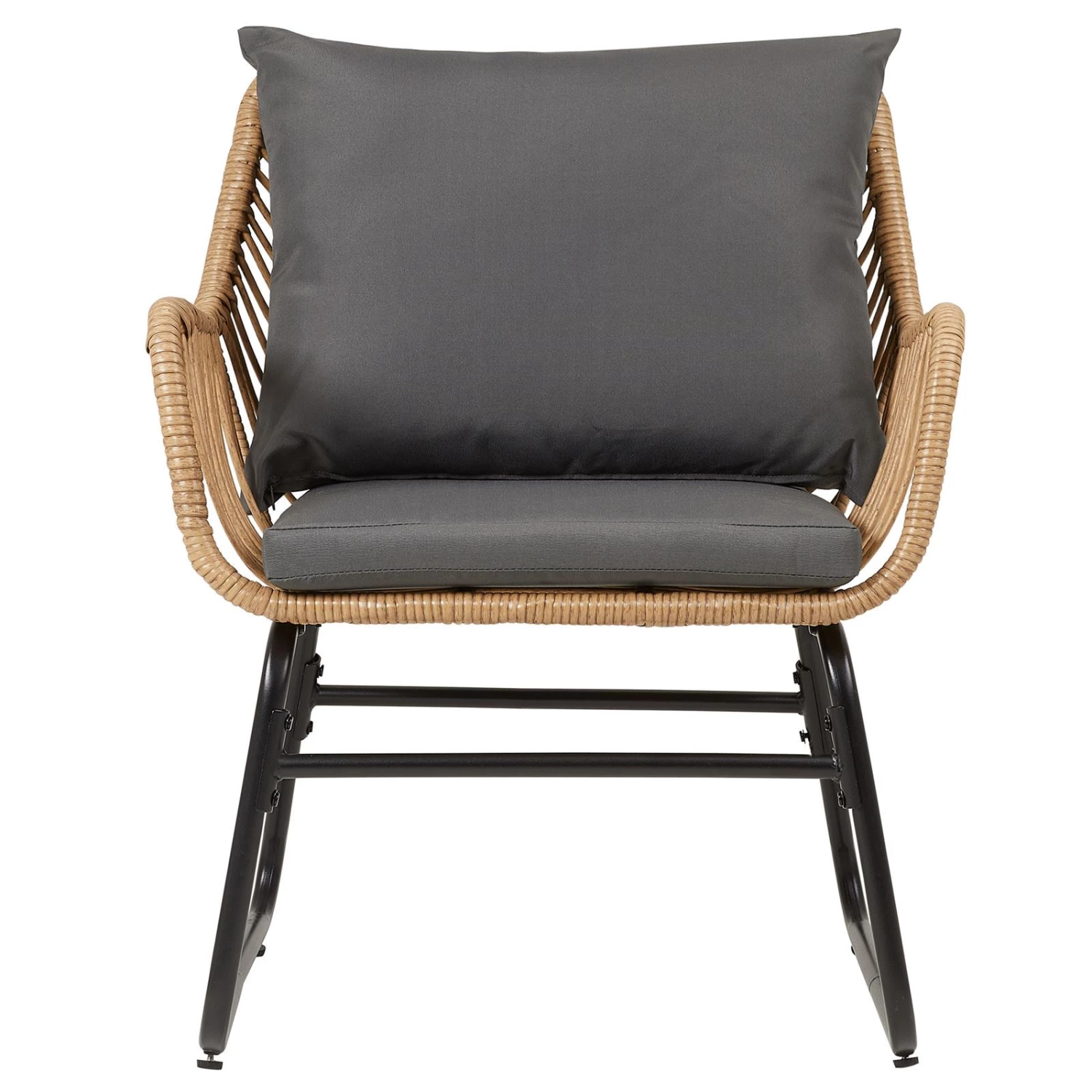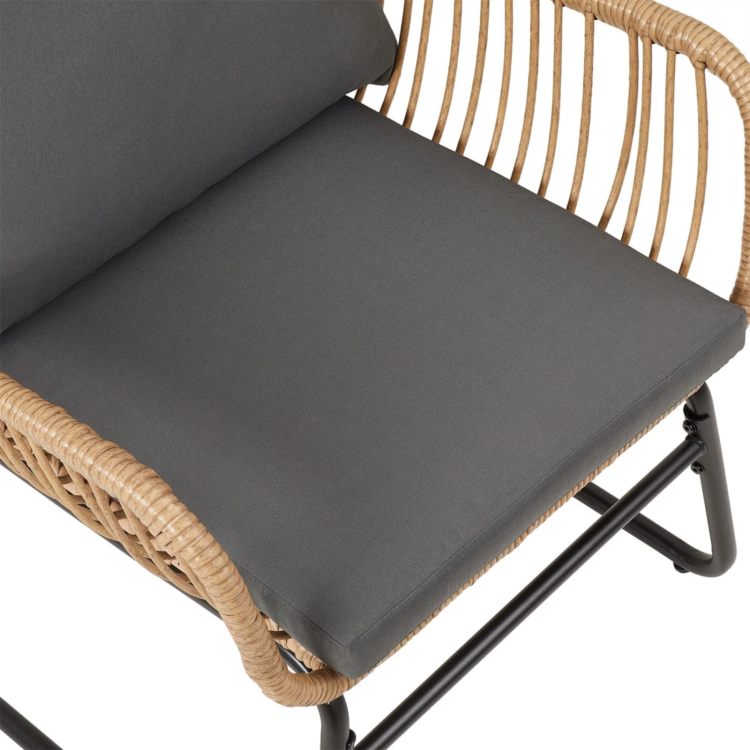 - Die Sitzschale besteht aus Metall und ist mit Polyrattan umhüllt.