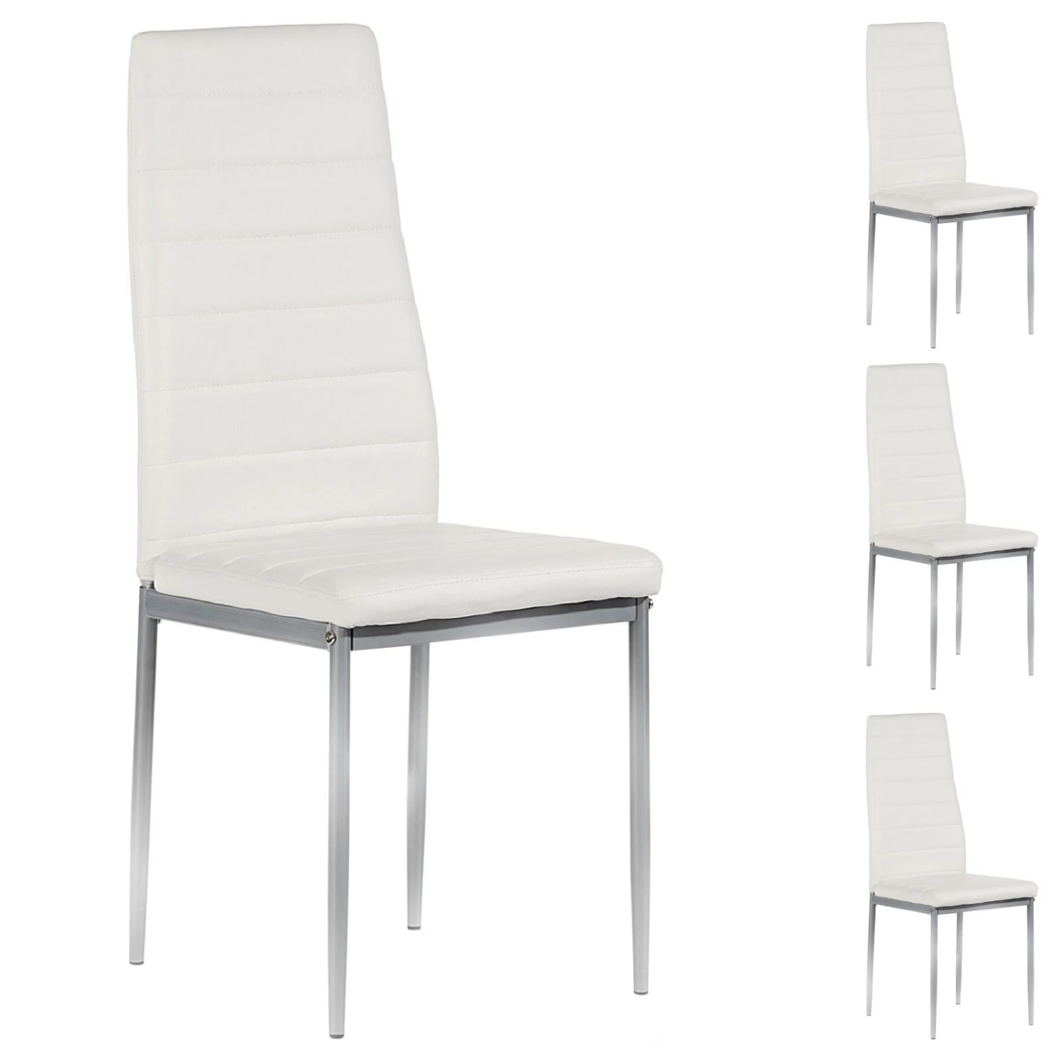 ist ein echter Verkaufsschlager! Vier Stühle werden zu einem unschlagbaren Preis verkauft. Das edle Design durch quergestreiftes Lederimitat und hochwertig lackierten Stuhlfüßen wertet jeden Esstisch auf. Die 4 cm dicke Polsterung sorgt für angenehmen Sitzkomfort, so dass man nach dem Essen gerne noch auf seinen neuen Stühlen verweilt. Diese Essgruppe lässt sich sehr platzsparend an den Esstisch schieben ohne mit einer Lehne am Esstisch anzustoßen.