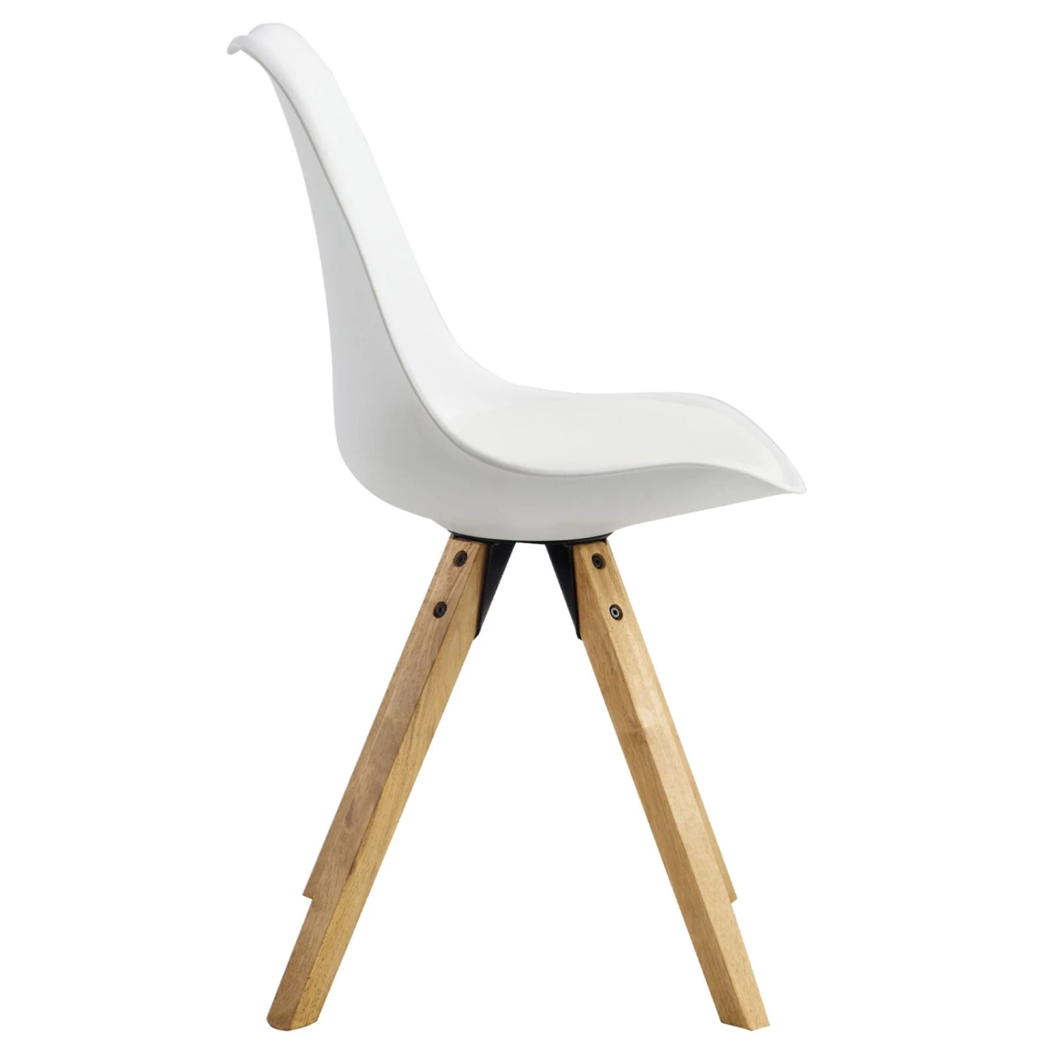- Die Sitzschale aus Kunststoff ist mit einem Bezug aus Kunstleder in der Farbe weiß überzogen.