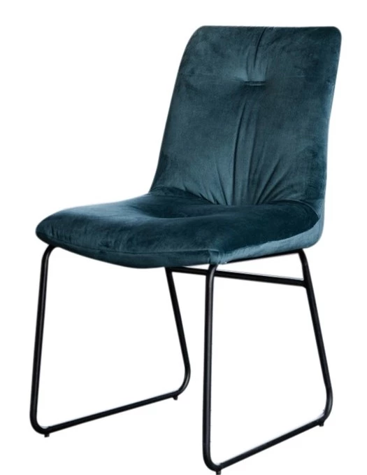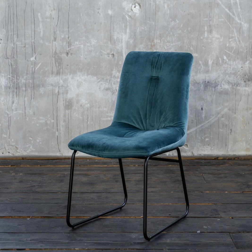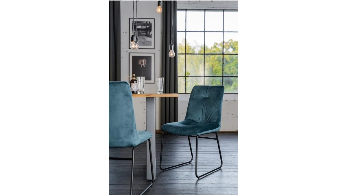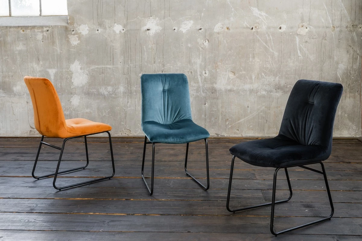 Die Kombination des hochwertigen, samtartigen Stoffs der Sitzschale mit den schwarzen, kufenförmigen Metallfüßen ergibt ein stilvolles Gesamtbild.