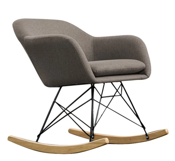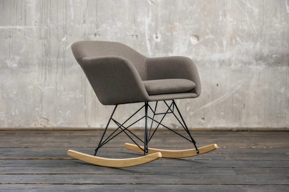 Die angenehme Polsterung des Schaukelstuhl wurde überzogen mit einem strapazierfähigen und langlebigen Polyester. Das Gestell des Stuhl wurde aus Metall gefertigt und ist sehr robust und stabil. In einer schönen Ergänzung zum dem grauen Stoff und dem dunklen Metall wurden die Kufen aus Eiche gefertigt.