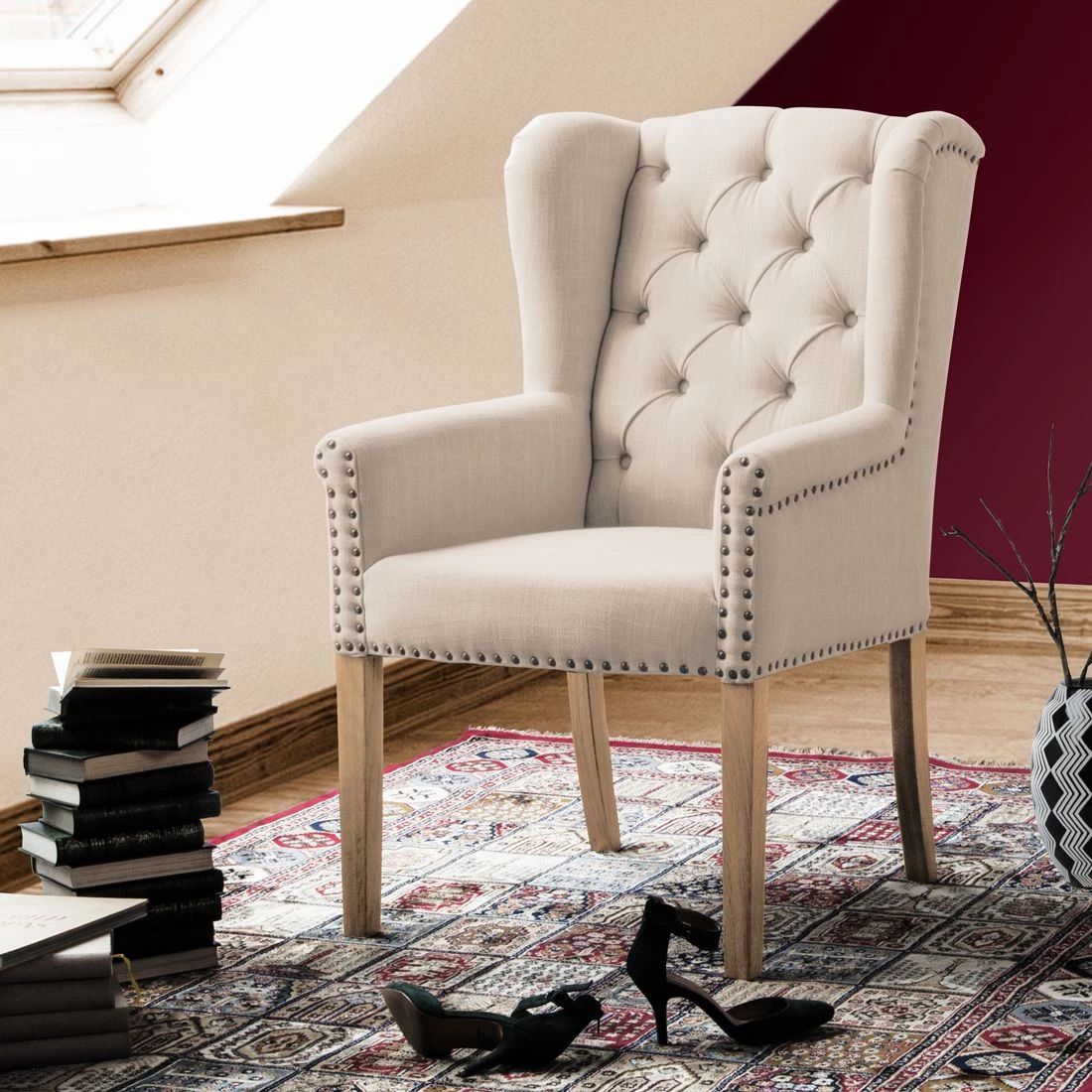 Der Esszimmerstuhl eignet sich nicht nur für den Essbereich, sondern ist auch als Lesesessel perfekt geeignet. Der Esszimmerstuhl ist mit einer weichen Polsterung versehen, die in Kombination mit dem angenehmen Bezugsstoff zu vielen gemütlichen Stunden einlädt. Dank der Armlehnen und der sogenannten Ohren können Sie sowohl die Arme als auch Ihren Kopf entspannt anlehnen. Der britische Lebensstil zeichnet sich durch ein entspanntes Nebeneinander verschiedener Stilrichtungen aus den unterschiedlichsten Epochen aus. Bringen Sie mit dem Esszimmerstuhl Madison die Eleganz britischer Leichtigkeit in Ihren Ess- oder Wohnbereich.