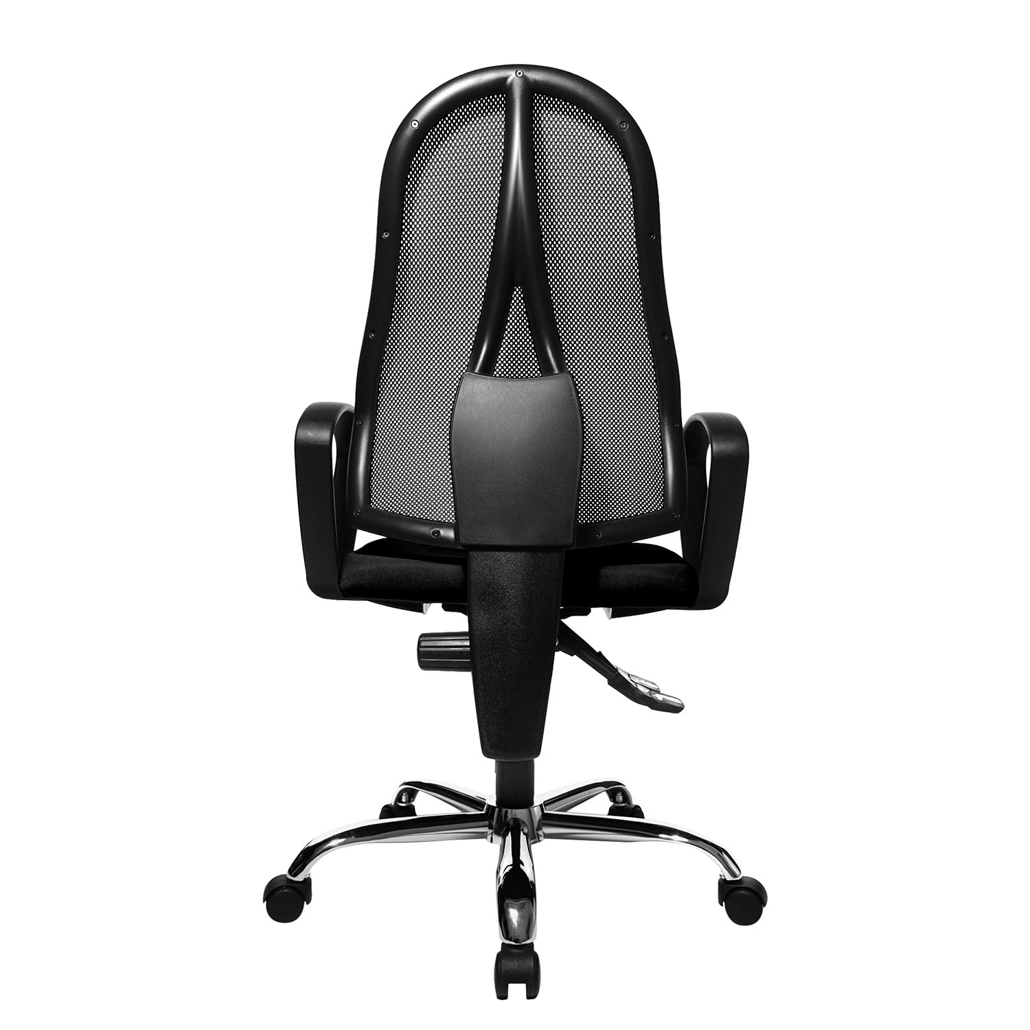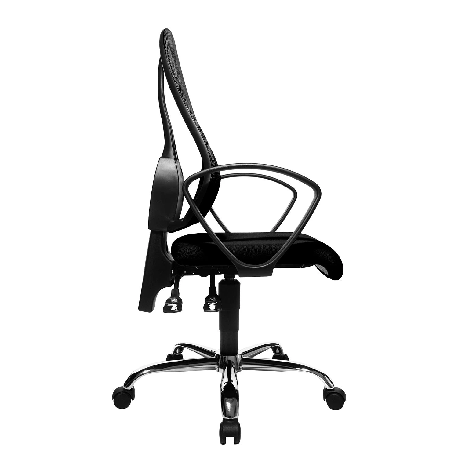 Mit diesem schwarzen Bürostuhl bietet Topstar die perfekte Sitzgelegenheit für Menschen mit einer modernen Einrichtung. Nicht zuletzt erwähnenswert ist auch die individuelle Höhenverstellbarkeit dieses Bürodrehstuhls. Der unkomplizierte Kunststoff des Bürodrehstuhls könnte kaum leichter zu pflegen sein. Mithilfe der Rollen an den Beinen lässt er sich außerdem flexibel in unterschiedlichen Räumen nutzen. Mit dem Bezug aus Netzstoff und Stoff überzeugt der Bürodrehstuhl darüber hinaus mit Behaglichkeit.