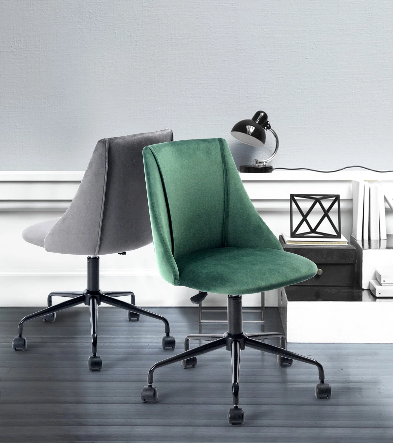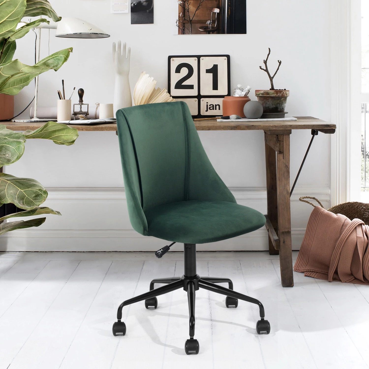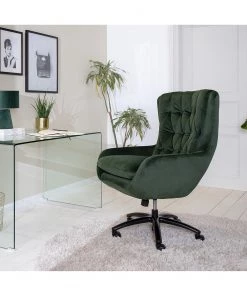 Unser grüner Samt-Bürostuhl ist zweifellos der ideale Sitz für eine trendige Büroecke in Ihrem Schlafzimmer, Ihrem Büro oder Ihrem Wohnzimmer. Dieses Modell, ganz in Eleganz und Nüchternheit, passt perfekt zu Ihrem Interieur.