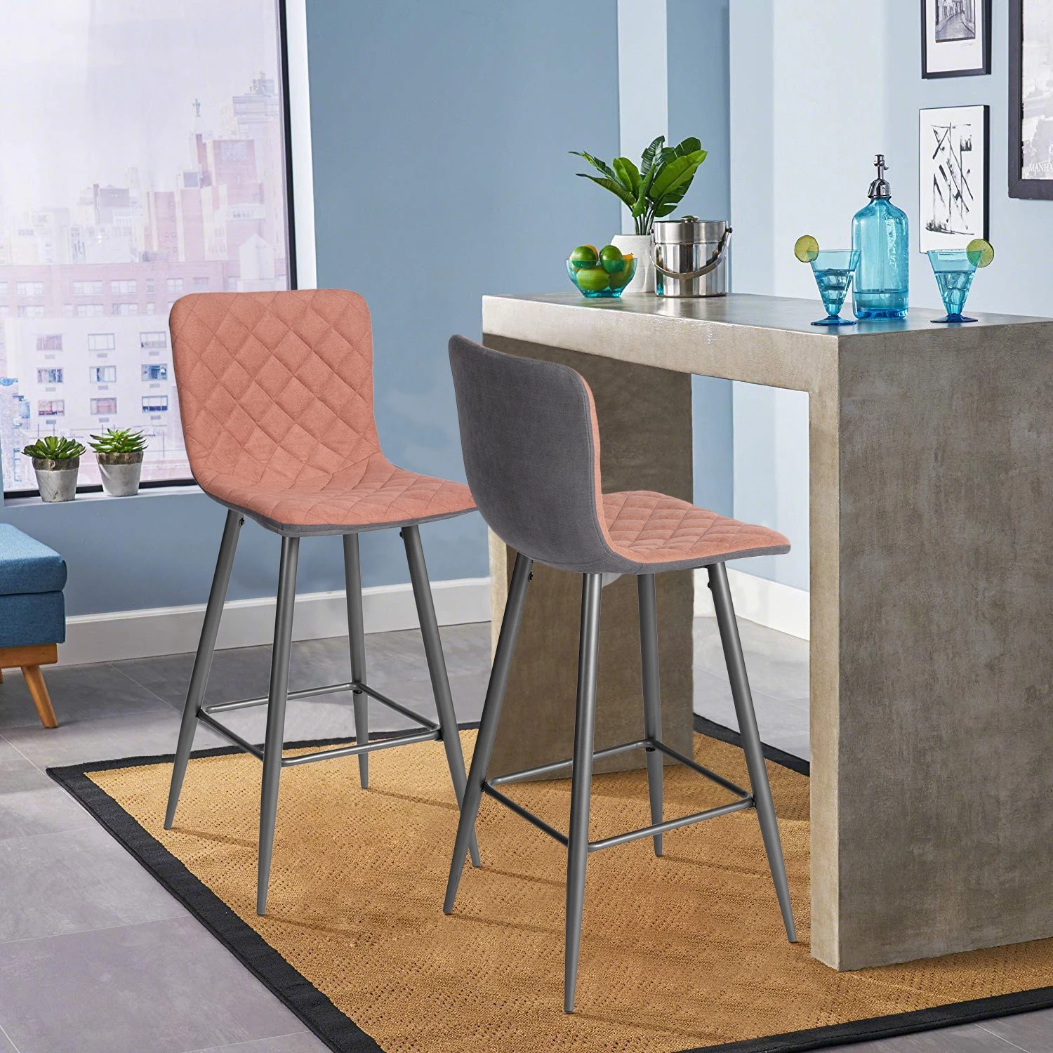 Unser Set aus zwei rosafarbenen Barhockern mit einer Sitzhöhe von 68 cm, ausgestattet mit viel geschätztem Komfort, kann in einem Barbereich, um eine Kücheninsel oder einen erhöhten geselligen Tisch eingesetzt werden.