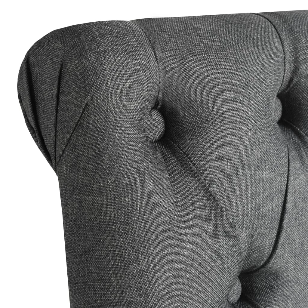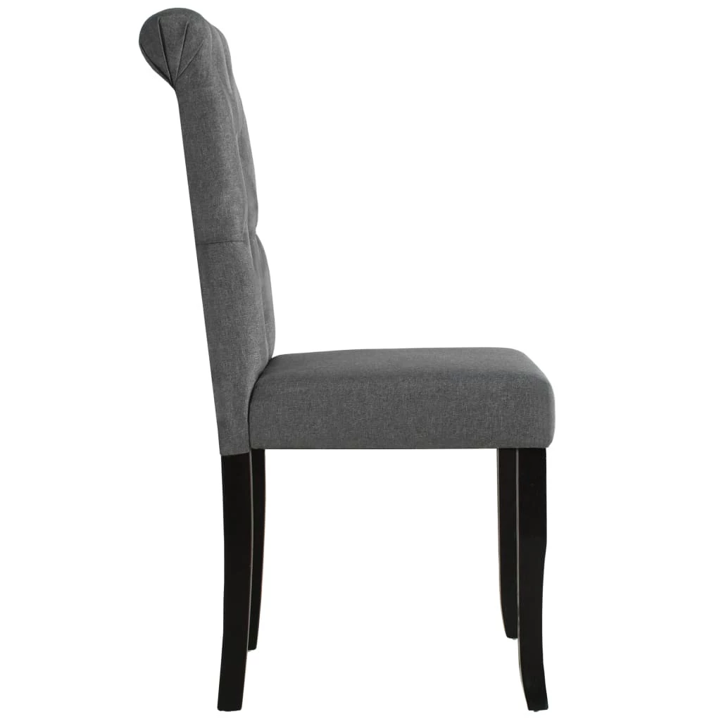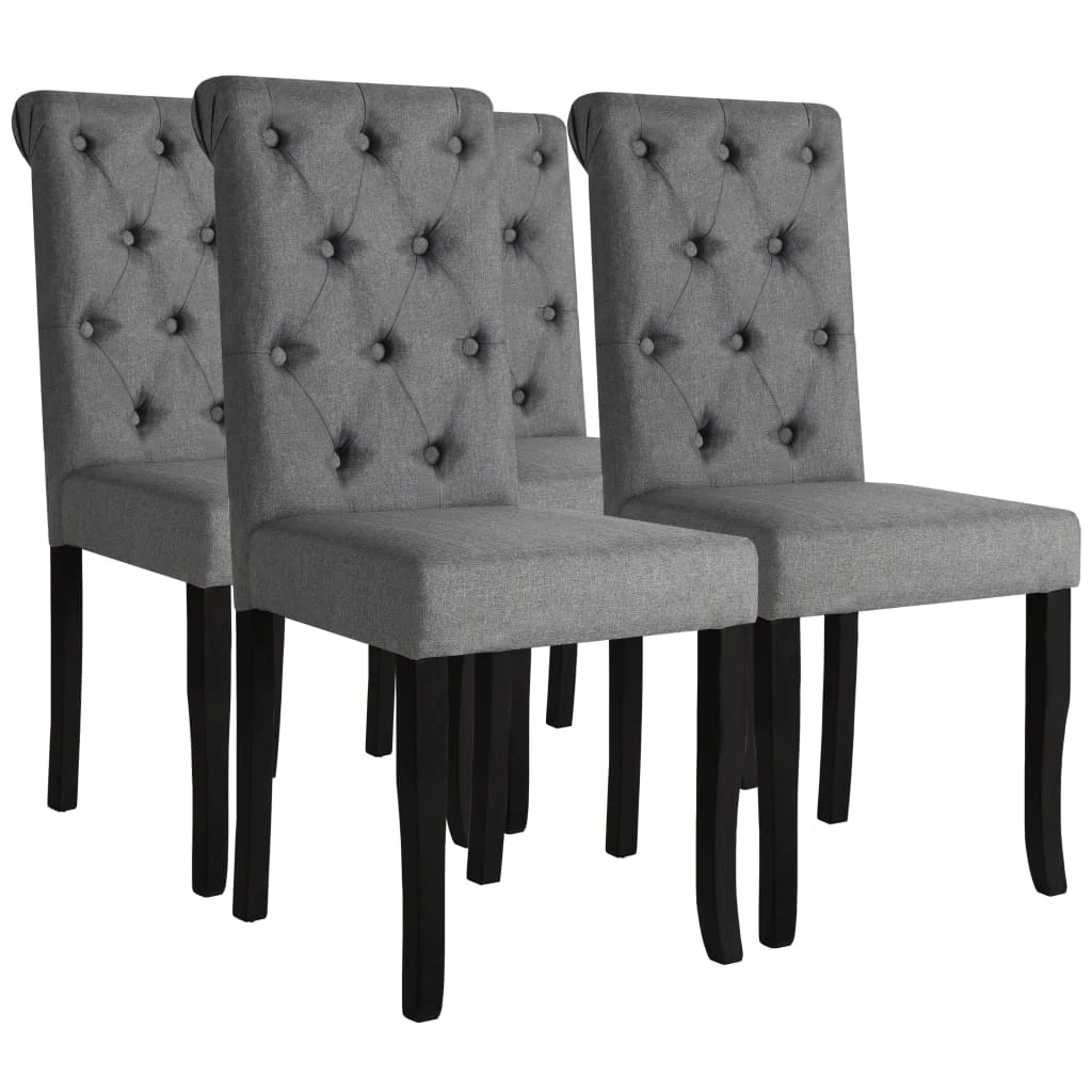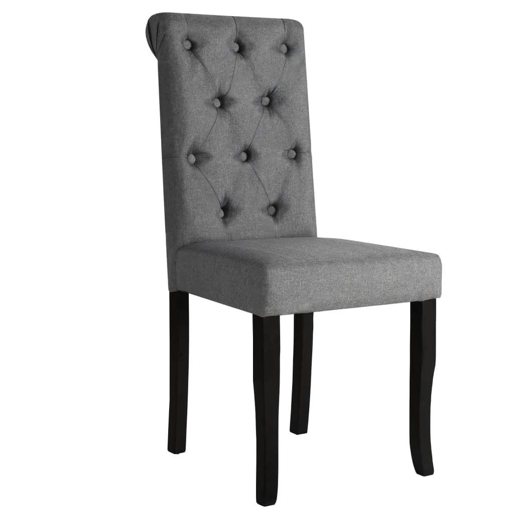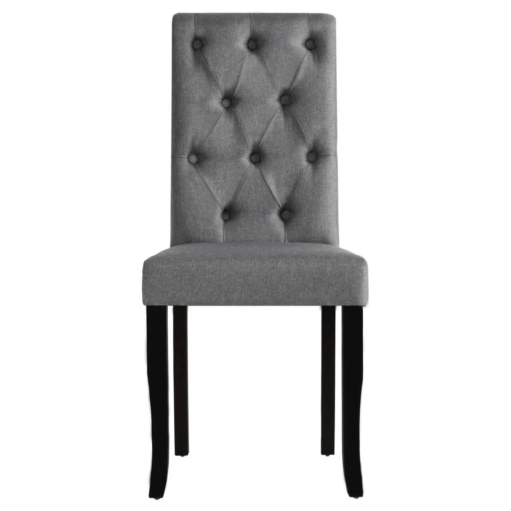 Dank der geschmeidig weichen Stoffpolsterung und Schaumstofffüllung sind die Stühle sehr bequem. Ein besonderes Detail bilden die dekorativen Knöpfe an der Rückenlehne, die für eine klassische Note sorgen.